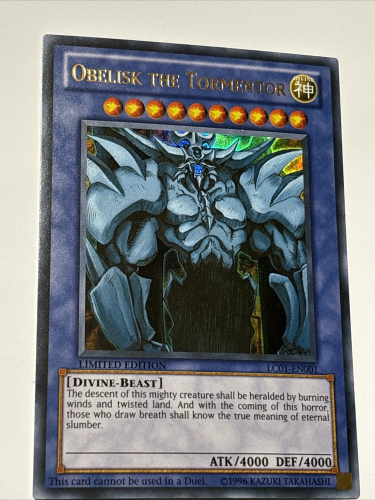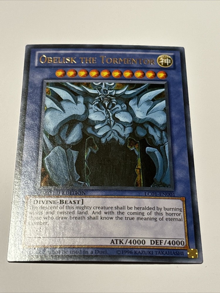 Elevate your Yu-Gi-Oh! TCG collection with the formidable Obelisk The Tormentor, a Divine-Beast card that has been captivating duelist since its inception. Dating back to 1996, this particular card boasts the iconic holo finish that makes it a standout piece.