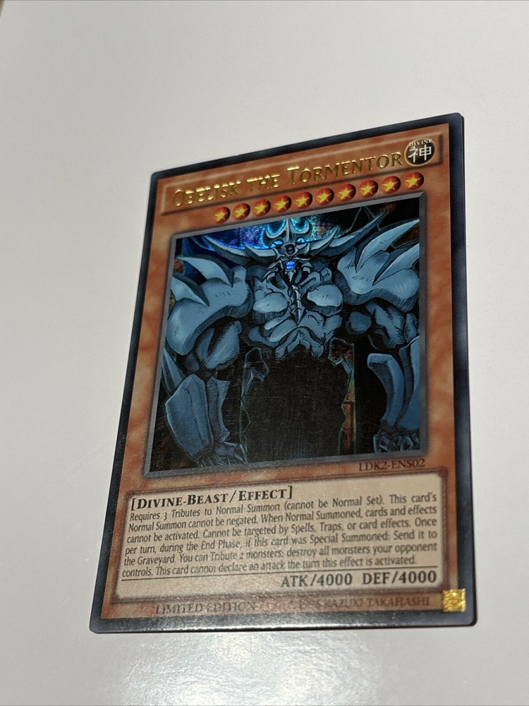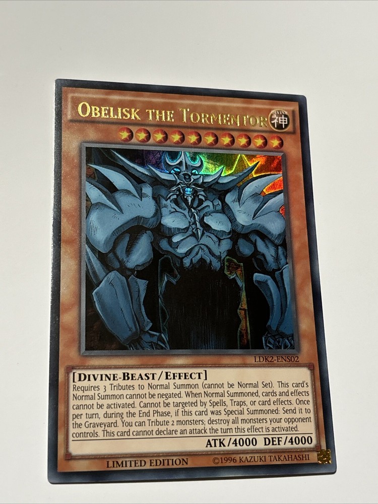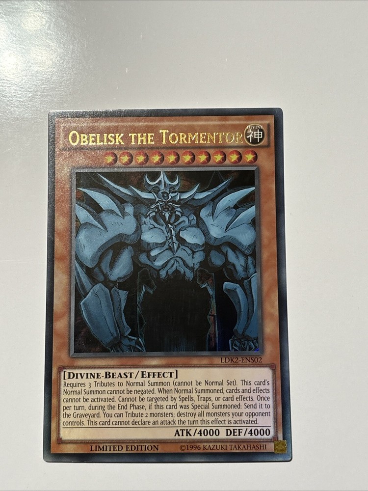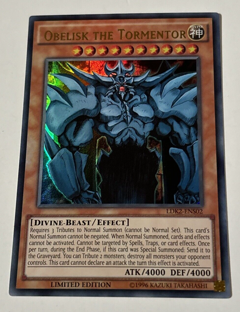 Step into the world of strategic duels with the classic "Obelisk The Tormentor" card from the Yu-Gi-Oh! TCG. This iconic Divine-Beast card, numbered LDK2-ENS02, features the formidable creature from the ancient Egyptians, carefully designed to add a touch of mythological might to your deck.