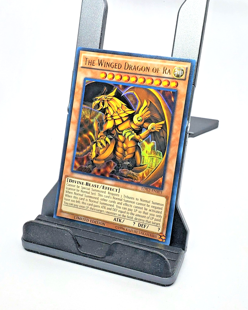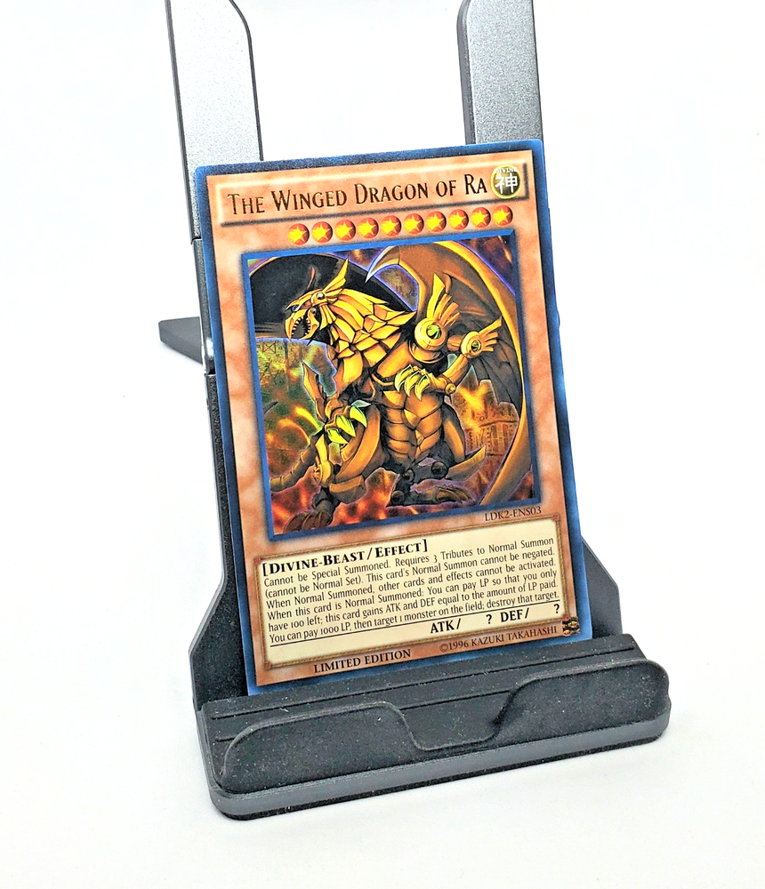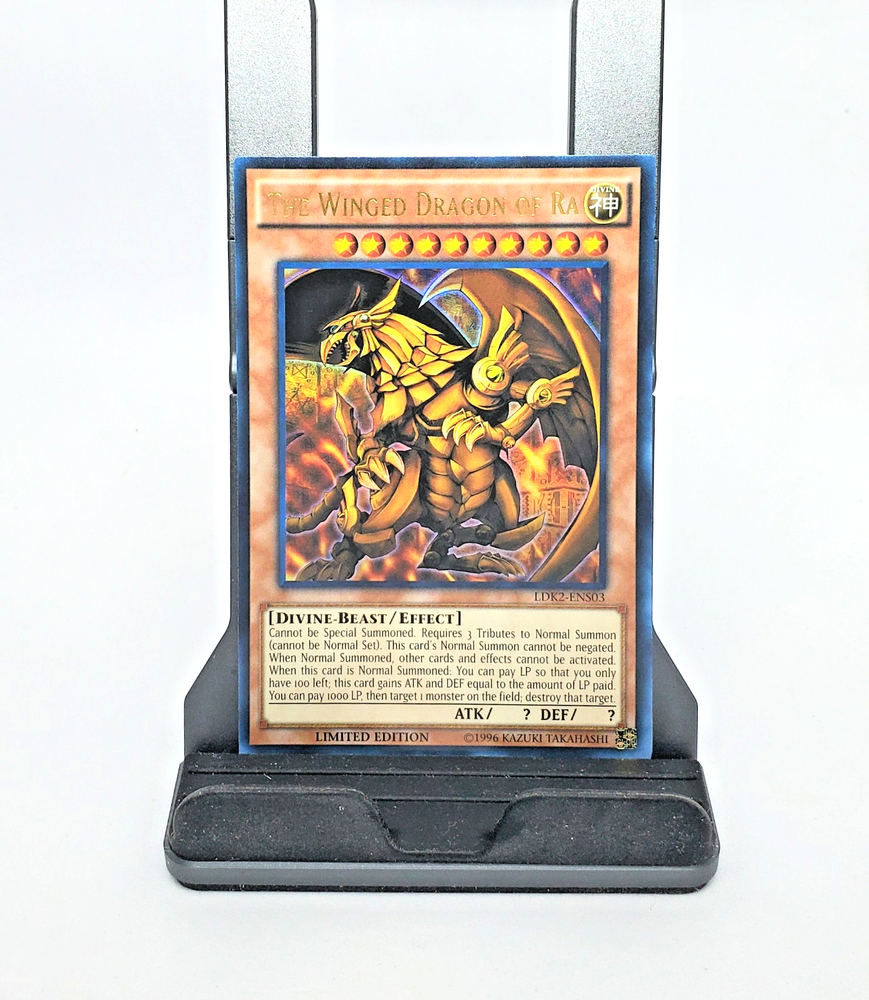 This 1996 Yugioh card is a must-have for collectors and fans of the Yu-Gi-Oh! TCG. Featuring the legendary Winged Dragon of Ra in an ultra rare, limited edition holographic finish, this card is a true treasure. The card is in English and suitable for ages 4 and up. Its rarity and vintage status make it a valuable addition to any collection. The card's country of manufacture is unknown. Its beautiful holo finish captures the eye and brings the artwork to life. Don't miss your chance to own this piece of Yu-Gi-Oh! history.
