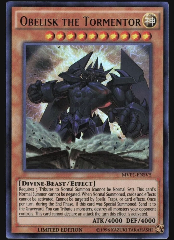 | Card Name | 1996 Yugioh NM Obelisk the Tormentor Ultra Rare Holo #MVP1-ENSV5 |