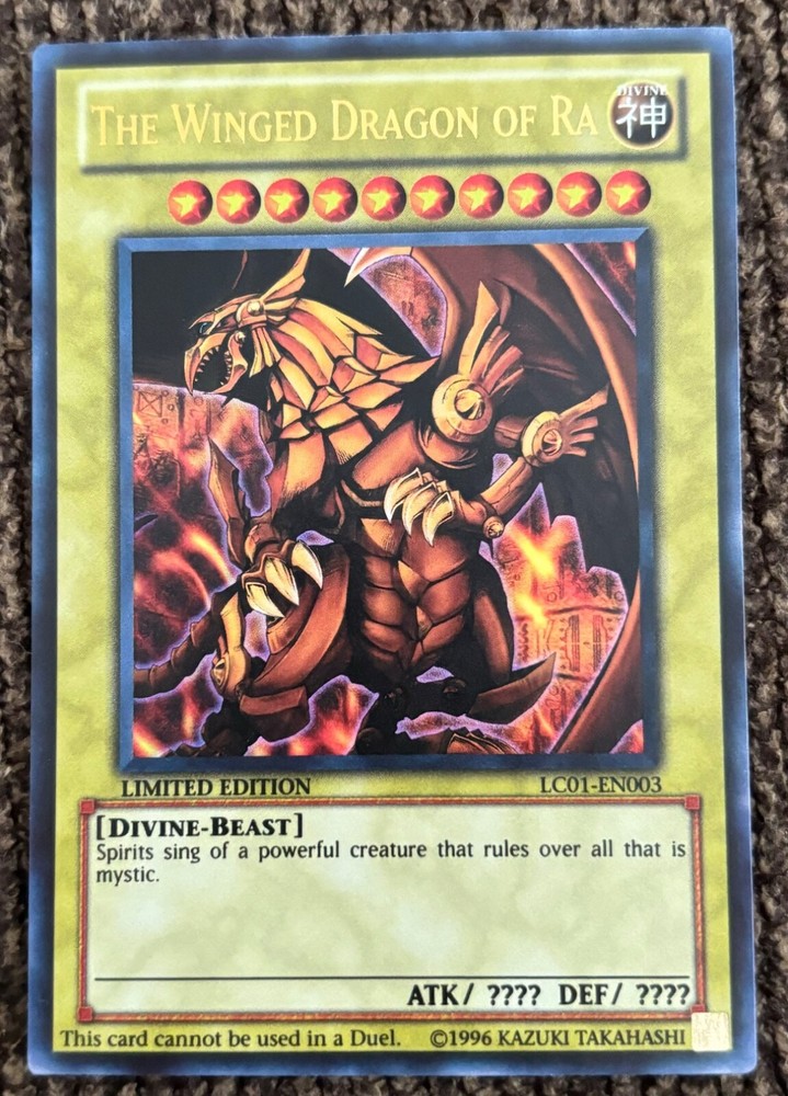 This rare and highly sought-after Yu-Gi-Oh! card features the powerful Winged dragon of Ra, illustrated by Kazuki Takahashi. Released in 1996, this card is from the Yugi set and is a must-have for any serious collector. The card number is 400015 and the card type is Yu-Gi-Oh!. With its stunning artwork and iconic character, this card is sure to impress any fan of the Yu-Gi-Oh! Trading Card Game. Whether you're a seasoned collector or just starting out, this card is a great addition to any collection. Don't miss your chance to own a piece of Yu-Gi-Oh! history with this rare winged dragon of Ra card.
