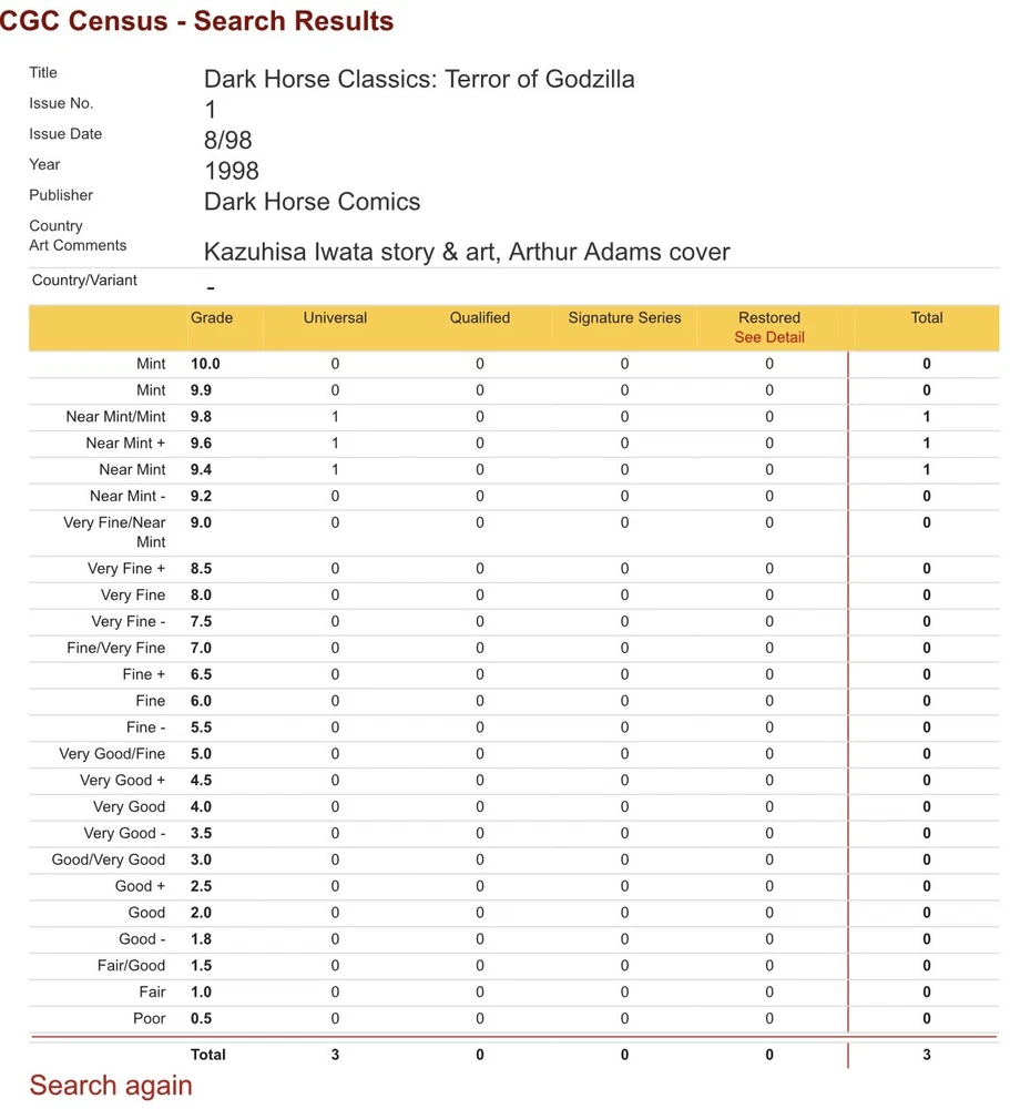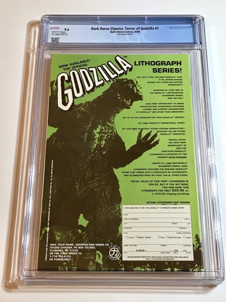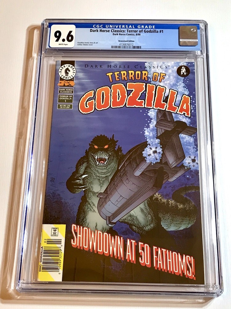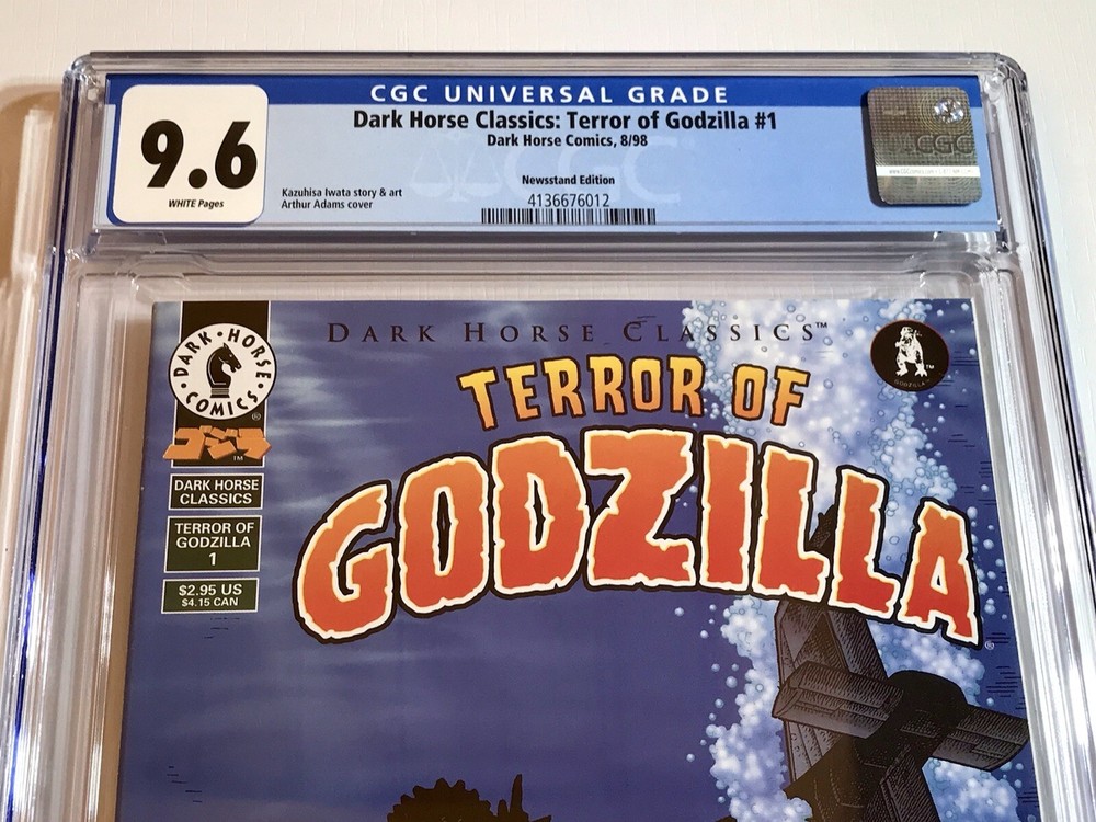 1998 DARK HORSE CLASSICS TERROR OF GODZILLA #1 ARTHUR ADAMS COVER RARE NEWSSTAND VARIANT. GRADED CGC 9.6 WHITE PAGES. ACTUAL ITEM IN PICTURES FOR SALE. Comicbookinvest website has data showing that in 1998, newsstand variants only made up between 5-10% of the total printed comic books on the market. Newsstand variants were not sold to collectors inside comic book retail stores. They were found at actual newsstands, often displayed in spinner racks inside liquor stores, grocery stores etc and were typically printed on lower quality paper and were never bagged and boarded and often abused. Very few newsstand variants survived making them extremely SCARCE in high grade and many unsold newsstand copies were either returned to the publisher or destroyed.