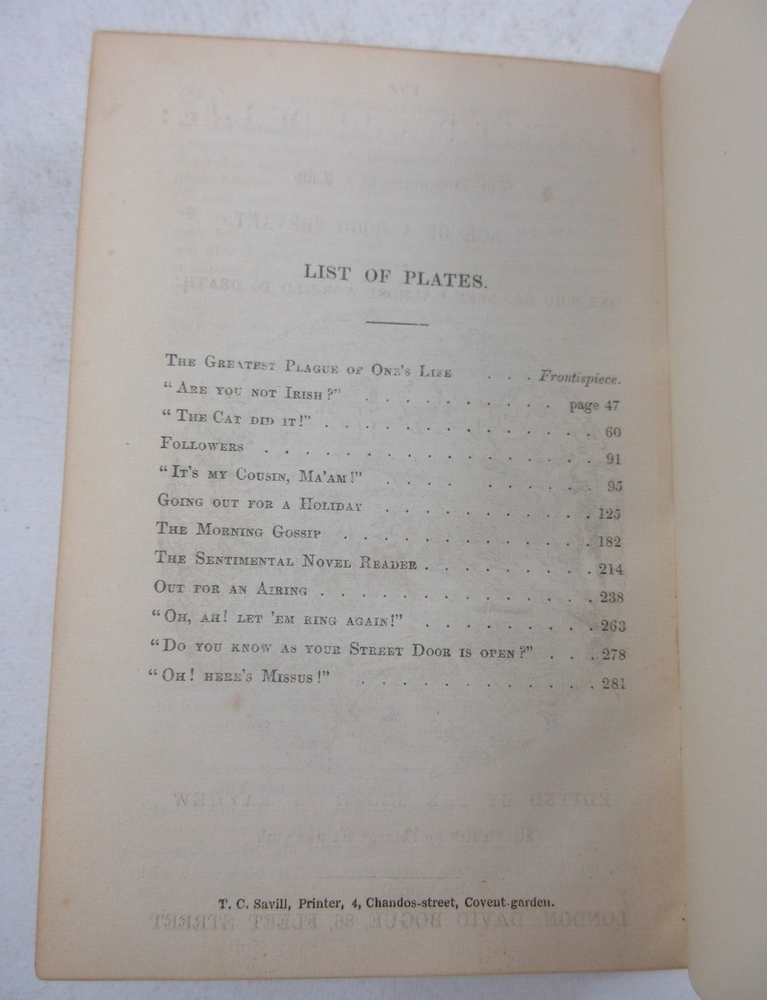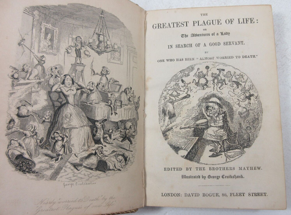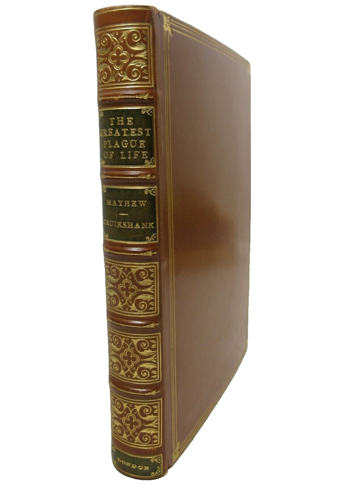 For sale is an excellent condition, leather-bound first edition of The Greatest Plauge of My Life or The Adventures of a Lady: In Search of a Good Servant. by One Who has been "Almost Worried to Death" by Augustus Mayhew with illustrations by George Cruikshank. First Edition p ublished in 1847 by David Bogue in London. Includes 12 illustrated plates throughout the book. P rofessionally bound in leather with marbled endpapers by bookbinders Root & Son. Binding is tight and pages are unmarked, with the exception very light age toning around the edges of the pages. Fore-edges feature gilded top stain (an intentional gold coloring used by the publisher on the page ends). Boards are clean and square with only light shelf wear. Leather spine looks excellent with bright title gilding. Please see photos for condition detail. shelf reference #L-1261