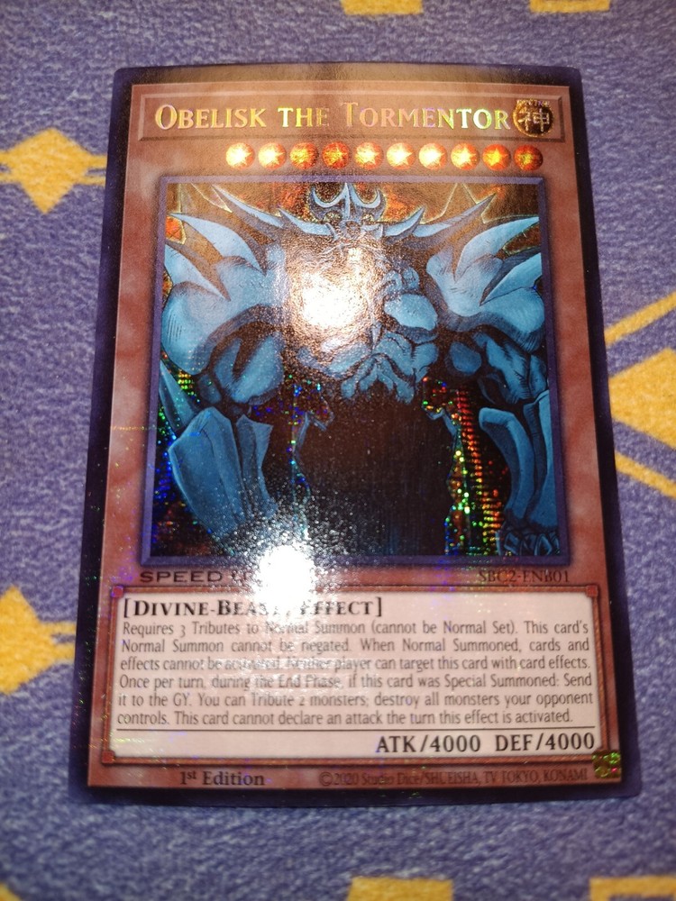 This Obelisk The Tormentor card is a must-have for collectors! The prismatic secret rare finish looks amazing, and it arrives safely in a top loader. The corners have minor wear as shown, but it's still in great condition for light play. Super happy with this purchase!