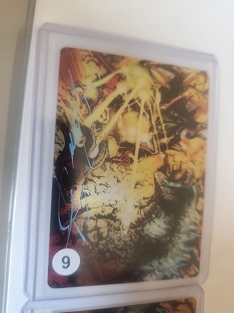 The product is a set of two metal comic cards featuring Godzilla and King Kong, signed by artist James Stokoe. These limited edition cards come with Certificates of Authenticity (COA) and are serial numbered, making them highly collectible items for fans of the Godzilla franchise. With a near mint or better condition, these cards are a must-have for collectors interested in rare and unique trading cards. The cards are stored in top loaders for added protection and display.
