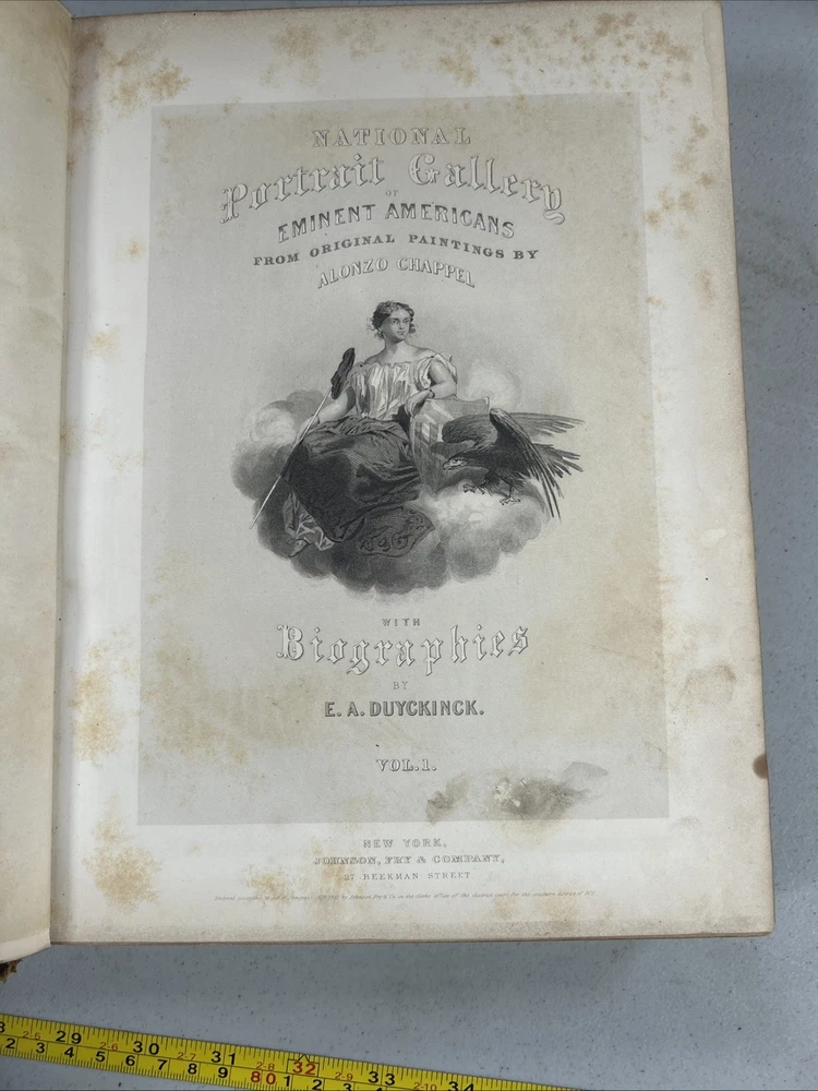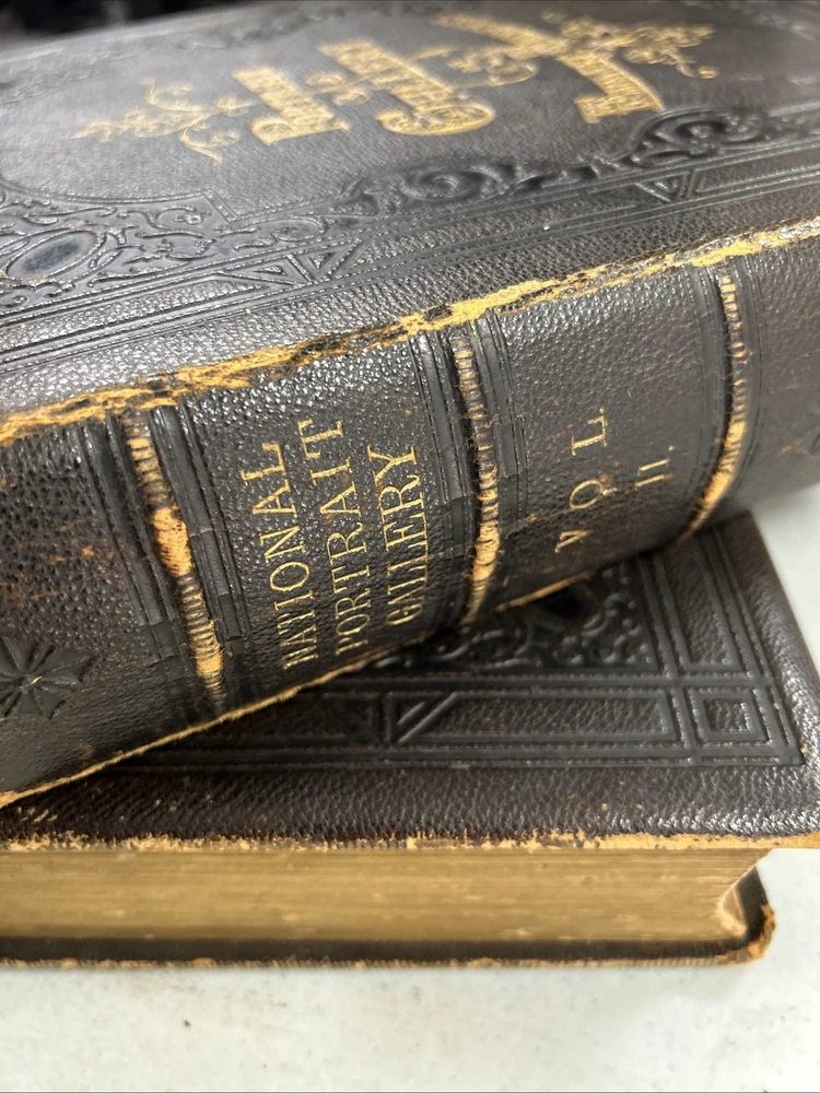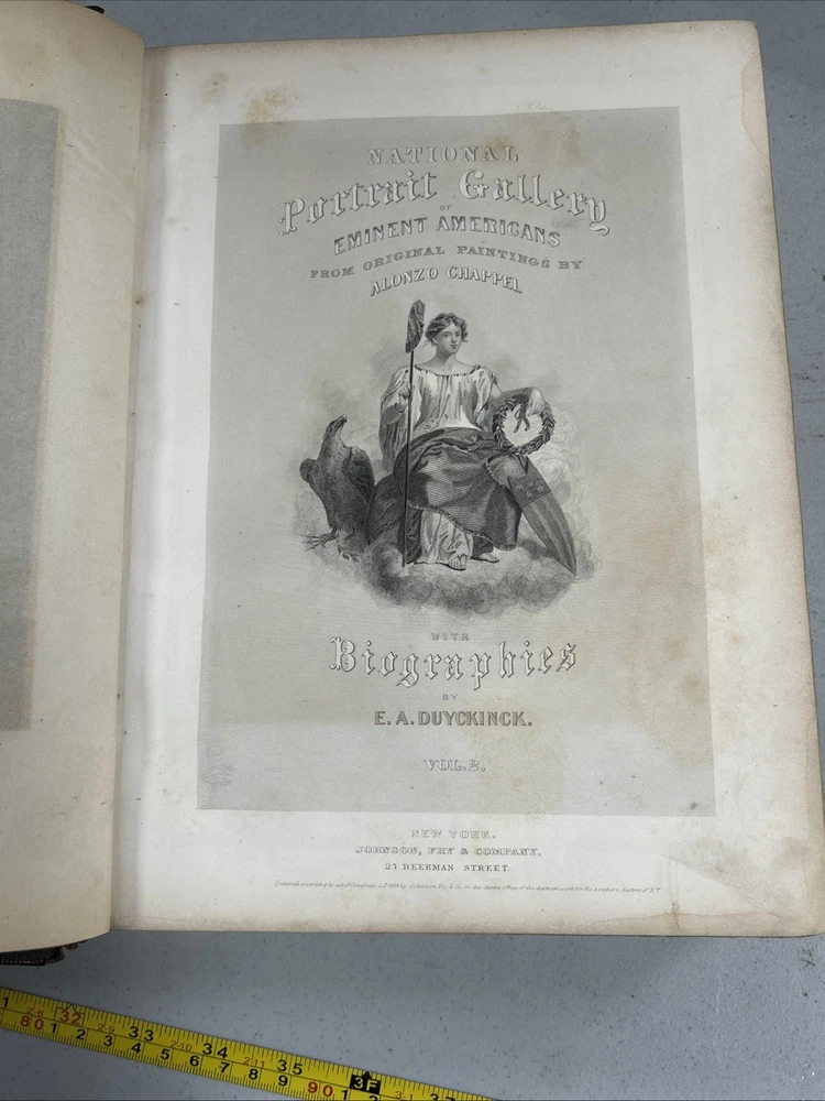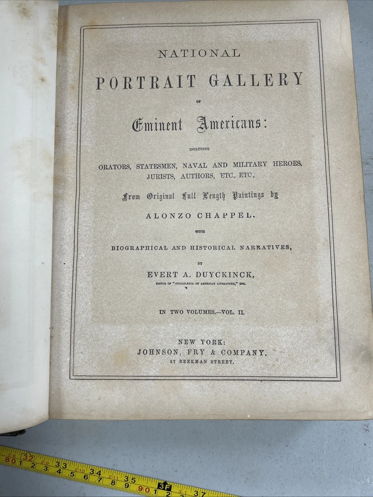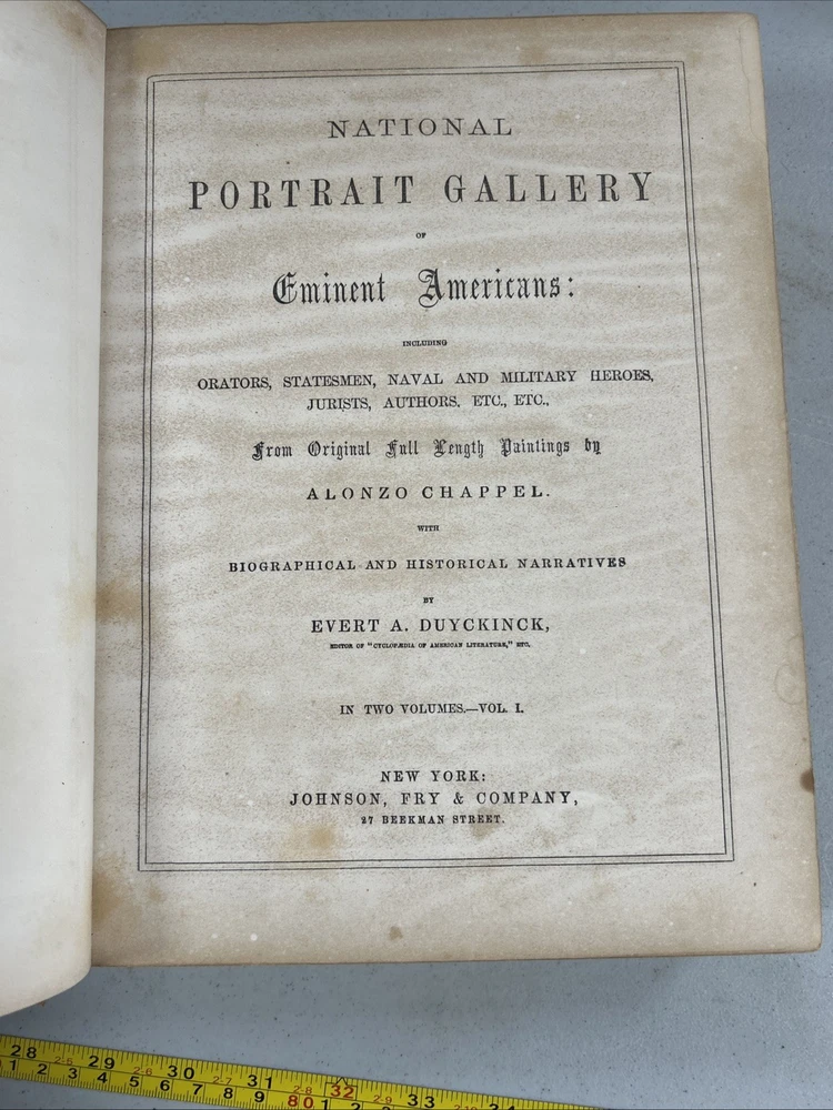 This set of two volumes of the "National Portrait Gallery of Eminent Americans" published in 1862 by Johnson Fry is a must-have for any art and biography lover. The books are beautifully bound in leather and feature illustrations of some of the most iconic figures of American history. The books are written in English and were published in New York. The set is an original copy and is in excellent condition. It is a perfect addition to any collection and will make a great gift for anyone interested in art and biography. The books are categorized under "Books & Magazines" and "Antiquarian & Collectible". Get your hands on this exquisite set today! Gold dusted page edges.