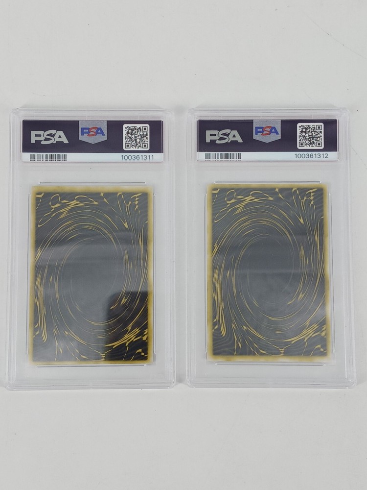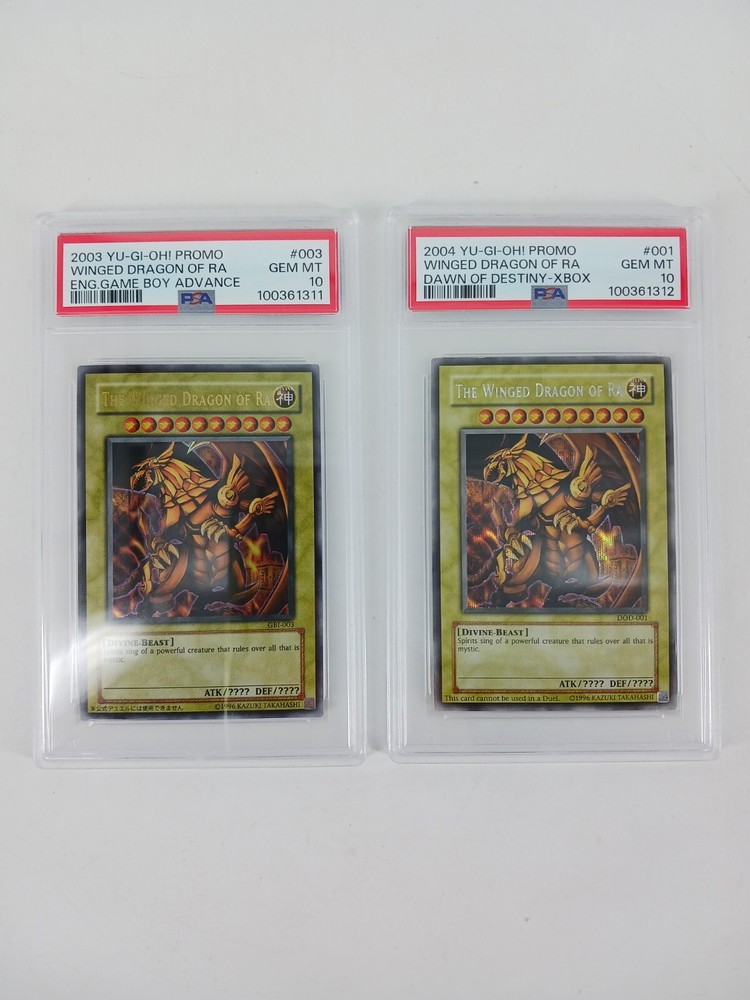 This listing is for the 2 YuGiOh Promo Winged Dragon of Ra 2003 2004 Secret Rare SEQUENTIAL CERT PSA 10. This set has Sequential PSA Certification Numbers! The 2003 Promo for the Game Boy Advance (Gold Lettering Ultra Rare) is 100361311, and the 2004 Promo For Dawn of Destiny Xbox game (Silver Holo Lettering Secret Rare) is 100361312. Both cards are graded at 10 Gem Mint! Please see photos for condition as the items pictured are the exact items you will receive.