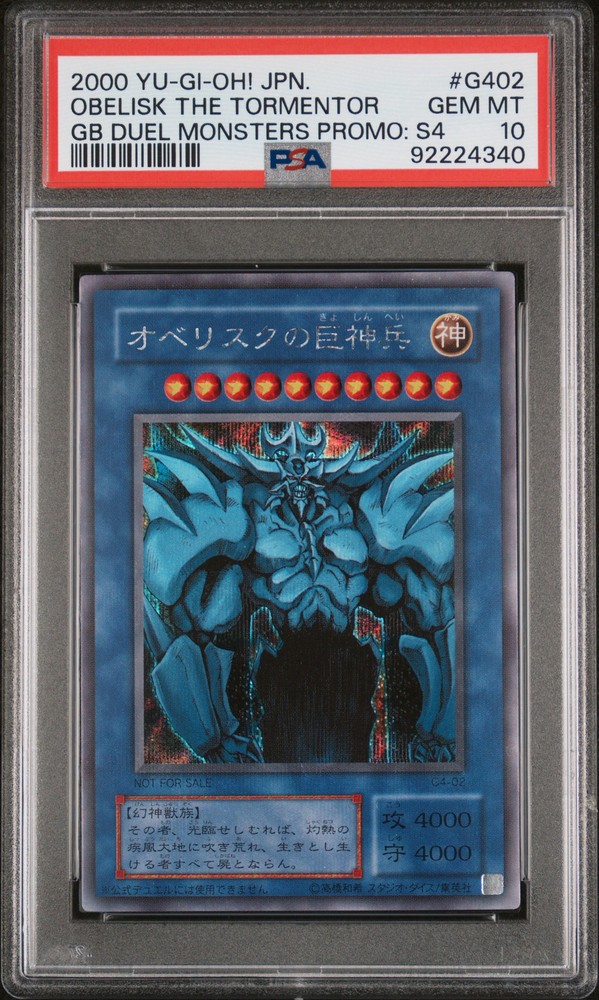 2000 YU-GI-OH! JAPANESE GAMEBOY DUEL MONSTERS PROMOS: SER. 4 #G402 OBELISK THE TORMENTOR PSA 10 2000 YU-GI-OH! JAPANESE GAMEBOY DUEL MONSTERS PROMOS: SER. 4 #G402 OBELISK THE TORMENTOR PSA 10 Purchase Info Thank you for your interest in this item consigned with PSA! By purchasing or making an offer on this item, you acknowledge and agree to the following terms: All sales are final. Returns not accepted. Payment must be made upon purchase of the item. All items are sold "as is" and without warranty of Collectors Universe, Inc. (d/b/a PSA), and ANY AND ALL IMPLIED WARRANTIES ARE DISCLAIMED AND EXCLUDED. Sales tax may apply depending on shipping address. PSA does not guarantee that another third-party grading company's authentication or certification of an item as genuine is correct or accurate. Neither a difference of opinion between third-party grading companies about authenticity, nor a company's subsequent reversal of its earlier authentication or certification of an item, will be a basis for rescinding a sale. Any dispute with another third-party grading company relating to the authenticity of an item must be resolved directly with that other company. Collectors' maximum liability in the event of loss or damage to an item during shipping will be the lesser of (a) the price paid for the item and (b) the change in fair market value of the item. You release Collectors from all other liability including for any claims of punitive damages, emotional distress, consequential damages, lost profits, or lost interest, except as prohibited by law. Shipping Purchased Items will be shipped directly from PSA Vault. You stay hands-free. PSA Vault When you purchase this item, you can save on sales tax and selling fees by keeping it in the PSA Vault, official Vault of eBay. Items already in PSA Vault and will be sent to PSA Vault will have no shipping charge Storage of any items with the PSA Vault will be subject to the PSA Vault Terms of Service. Consignment PSA has competitive rates on the world's largest collectibles marketplace with the option to list from the PSA Vault or immediately after PSA authentication and grading. Sale Price Under $100 $100 - $499 $500 - $999 $1,000 - $2,499 $2,500 - $4,999 $5,000+ Seller Fee 16% 14% 13% 10% 9% 7% Sellers pay a single fee as reflected above; no additional eBay fees are incurred. There is a $5 minimum fee on sold items.