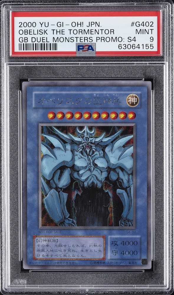 2000 YU-GI-OH! JAPANESE GAMEBOY DUEL MONSTERS PROMOS: SER. 4 #G402 OBELISK THE TORMENTOR PSA 9 2000 YU-GI-OH! JAPANESE GAMEBOY DUEL MONSTERS PROMOS: SER. 4 #G402 OBELISK THE TORMENTOR PSA 9 Purchase Info Thank you for your interest in this item consigned with PSA! By purchasing or making an offer on this item, you acknowledge and agree to the following terms: All sales are final. Returns not accepted. Payment must be made upon purchase of the item. All items are sold "as is" and without warranty of Collectors Universe, Inc. (d/b/a PSA), and ANY AND ALL IMPLIED WARRANTIES ARE DISCLAIMED AND EXCLUDED. Sales tax may apply depending on shipping address. PSA does not guarantee that another third-party grading company's authentication or certification of an item as genuine is correct or accurate. Neither a difference of opinion between third-party grading companies about authenticity, nor a company's subsequent reversal of its earlier authentication or certification of an item, will be a basis for rescinding a sale. Any dispute with another third-party grading company relating to the authenticity of an item must be resolved directly with that other company. Collectors' maximum liability in the event of loss or damage to an item during shipping will be the lesser of (a) the price paid for the item and (b) the change in fair market value of the item. You release Collectors from all other liability including for any claims of punitive damages, emotional distress, consequential damages, lost profits, or lost interest, except as prohibited by law. Shipping Purchased Items will be shipped directly from PSA Vault. You stay hands-free. PSA Vault When you purchase this item, you can save on sales tax and selling fees by keeping it in the PSA Vault, official Vault of eBay. Items already in PSA Vault and will be sent to PSA Vault will have no shipping charge Storage of any items with the PSA Vault will be subject to the PSA Vault Terms of Service. Consignment PSA has competitive rates on the world's largest collectibles marketplace with the option to list from the PSA Vault or immediately after PSA authentication and grading. Sale Price Under $100 $100 - $499 $500 - $999 $1,000 - $2,499 $2,500 - $4,999 $5,000+ Seller Fee 16% 14% 13% 10% 9% 7% Sellers pay a single fee as reflected above; no additional eBay fees are incurred. There is a $5 minimum fee on sold items.