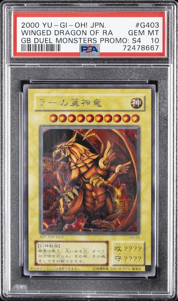 2000 YU-GI-OH! JAPANESE GAMEBOY DUEL MONSTERS PROMOS: SER. 4 #G403 THE WINGED DRAGON OF RA PSA 10 2000 YU-GI-OH! JAPANESE GAMEBOY DUEL MONSTERS PROMOS: SER. 4 #G403 THE WINGED DRAGON OF RA PSA 10 Purchase Info Thank you for your interest in this item consigned with PSA! By purchasing or making an offer on this item, you acknowledge and agree to the following terms: All sales are final. Returns not accepted. Payment must be made upon purchase of the item. All items are sold "as is" and without warranty of Collectors Universe, Inc. (d/b/a PSA), and ANY AND ALL IMPLIED WARRANTIES ARE DISCLAIMED AND EXCLUDED. Sales tax may apply depending on shipping address. PSA does not guarantee that another third-party grading company's authentication or certification of an item as genuine is correct or accurate. Neither a difference of opinion between third-party grading companies about authenticity, nor a company's subsequent reversal of its earlier authentication or certification of an item, will be a basis for rescinding a sale. Any dispute with another third-party grading company relating to the authenticity of an item must be resolved directly with that other company. Collectors' maximum liability in the event of loss or damage to an item during shipping will be the lesser of (a) the price paid for the item and (b) the change in fair market value of the item. You release Collectors from all other liability including for any claims of punitive damages, emotional distress, consequential damages, lost profits, or lost interest, except as prohibited by law. Shipping Purchased Items will be shipped directly from PSA Vault. You stay hands-free. PSA Vault When you purchase this item, you can save on sales tax and selling fees by keeping it in the PSA Vault, official Vault of eBay. Items already in PSA Vault and will be sent to PSA Vault will have no shipping charge Storage of any items with the PSA Vault will be subject to the PSA Vault Terms of Service. Consignment PSA has competitive rates on the world's largest collectibles marketplace with the option to list from the PSA Vault or immediately after PSA authentication and grading. Sale Price Under $100 $100 - $499 $500 - $999 $1,000 - $2,499 $2,500 - $4,999 $5,000+ Seller Fee 16% 14% 13% 10% 9% 7% Sellers pay a single fee as reflected above; no additional eBay fees are incurred. There is a $5 minimum fee on sold items.