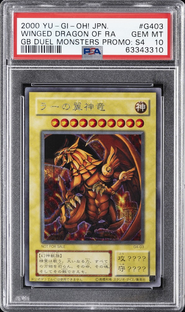 2000 YU-GI-OH! JAPANESE GAMEBOY DUEL MONSTERS PROMOS: SER. 4 #G403 THE WINGED DRAGON OF RA PSA 10 2000 YU-GI-OH! JAPANESE GAMEBOY DUEL MONSTERS PROMOS: SER. 4 #G403 THE WINGED DRAGON OF RA PSA 10 Purchase Info Thank you for your interest in this item consigned with PSA! By purchasing or making an offer on this item, you acknowledge and agree to the following terms: All sales are final. Returns not accepted. Payment must be made upon purchase of the item. All items are sold "as is" and without warranty of Collectors Universe, Inc. (d/b/a PSA), and ANY AND ALL IMPLIED WARRANTIES ARE DISCLAIMED AND EXCLUDED. Sales tax may apply depending on shipping address. PSA does not guarantee that another third-party grading company's authentication or certification of an item as genuine is correct or accurate. Neither a difference of opinion between third-party grading companies about authenticity, nor a company's subsequent reversal of its earlier authentication or certification of an item, will be a basis for rescinding a sale. Any dispute with another third-party grading company relating to the authenticity of an item must be resolved directly with that other company. Collectors' maximum liability in the event of loss or damage to an item during shipping will be the lesser of (a) the price paid for the item and (b) the change in fair market value of the item. You release Collectors from all other liability including for any claims of punitive damages, emotional distress, consequential damages, lost profits, or lost interest, except as prohibited by law. Shipping Purchased Items will be shipped directly from PSA Vault. You stay hands-free. PSA Vault When you purchase this item, you can save on sales tax and selling fees by keeping it in the PSA Vault, official Vault of eBay. Items already in PSA Vault and will be sent to PSA Vault will have no shipping charge Storage of any items with the PSA Vault will be subject to the PSA Vault Terms of Service. Consignment PSA has competitive rates on the world's largest collectibles marketplace with the option to list from the PSA Vault or immediately after PSA authentication and grading. Sale Price Under $100 $100 - $499 $500 - $999 $1,000 - $2,499 $2,500 - $4,999 $5,000+ Seller Fee 16% 14% 13% 10% 9% 7% Sellers pay a single fee as reflected above; no additional eBay fees are incurred. There is a $5 minimum fee on sold items.