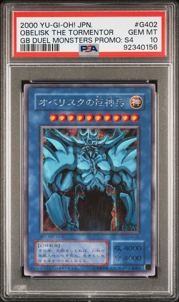 2000 YU-GI-OH! JAPANESE GAMEBOY DUEL MONSTERS PROMOS: SER. 4 #G402 OBELISK THE TORMENTOR PSA 10 2000 YU-GI-OH! JAPANESE GAMEBOY DUEL MONSTERS PROMOS: SER. 4 #G402 OBELISK THE TORMENTOR PSA 10 Purchase Info Thank you for your interest in this item consigned with PSA! By purchasing or making an offer on this item, you acknowledge and agree to the following terms: All sales are final. Returns not accepted. Payment must be made upon purchase of the item. All items are sold "as is" and without warranty of Collectors Universe, Inc. (d/b/a PSA), and ANY AND ALL IMPLIED WARRANTIES ARE DISCLAIMED AND EXCLUDED. Sales tax may apply depending on shipping address. PSA does not guarantee that another third-party grading company's authentication or certification of an item as genuine is correct or accurate. Neither a difference of opinion between third-party grading companies about authenticity, nor a company's subsequent reversal of its earlier authentication or certification of an item, will be a basis for rescinding a sale. Any dispute with another third-party grading company relating to the authenticity of an item must be resolved directly with that other company. Collectors' maximum liability in the event of loss or damage to an item during shipping will be the lesser of (a) the price paid for the item and (b) the change in fair market value of the item. You release Collectors from all other liability including for any claims of punitive damages, emotional distress, consequential damages, lost profits, or lost interest, except as prohibited by law. Shipping Purchased Items will be shipped directly from PSA Vault. You stay hands-free. PSA Vault When you purchase this item, you can save on sales tax and selling fees by keeping it in the PSA Vault, official Vault of eBay. Items already in PSA Vault and will be sent to PSA Vault will have no shipping charge Storage of any items with the PSA Vault will be subject to the PSA Vault Terms of Service. Consignment PSA has competitive rates on the world's largest collectibles marketplace with the option to list from the PSA Vault or immediately after PSA authentication and grading. Sale Price Under $100 $100 - $499 $500 - $999 $1,000 - $2,499 $2,500 - $4,999 $5,000+ Seller Fee 16% 14% 13% 10% 9% 7% Sellers pay a single fee as reflected above; no additional eBay fees are incurred. There is a $5 minimum fee on sold items.