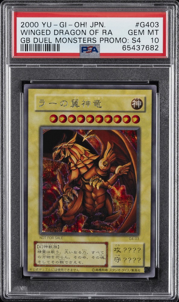 2000 YU-GI-OH! JAPANESE GAMEBOY DUEL MONSTERS PROMOS: SER. 4 #G403 THE WINGED DRAGON OF RA PSA 10 2000 YU-GI-OH! JAPANESE GAMEBOY DUEL MONSTERS PROMOS: SER. 4 #G403 THE WINGED DRAGON OF RA PSA 10 Purchase Info Thank you for your interest in this item consigned with PSA! By purchasing or making an offer on this item, you acknowledge and agree to the following terms: All sales are final. Returns not accepted. Payment must be made upon purchase of the item. All items are sold "as is" and without warranty of Collectors Universe, Inc. (d/b/a PSA), and ANY AND ALL IMPLIED WARRANTIES ARE DISCLAIMED AND EXCLUDED. Sales tax may apply depending on shipping address. PSA does not guarantee that another third-party grading company's authentication or certification of an item as genuine is correct or accurate. Neither a difference of opinion between third-party grading companies about authenticity, nor a company's subsequent reversal of its earlier authentication or certification of an item, will be a basis for rescinding a sale. Any dispute with another third-party grading company relating to the authenticity of an item must be resolved directly with that other company. Collectors' maximum liability in the event of loss or damage to an item during shipping will be the lesser of (a) the price paid for the item and (b) the change in fair market value of the item. You release Collectors from all other liability including for any claims of punitive damages, emotional distress, consequential damages, lost profits, or lost interest, except as prohibited by law. Shipping Purchased Items will be shipped directly from PSA Vault. You stay hands-free. PSA Vault When you purchase this item, you can save on sales tax and selling fees by keeping it in the PSA Vault, official Vault of eBay. Items already in PSA Vault and will be sent to PSA Vault will have no shipping charge Storage of any items with the PSA Vault will be subject to the PSA Vault Terms of Service. Consignment PSA has competitive rates on the world's largest collectibles marketplace with the option to list from the PSA Vault or immediately after PSA authentication and grading. Sale Price Under $100 $100 - $499 $500 - $999 $1,000 - $2,499 $2,500 - $4,999 $5,000+ Seller Fee 16% 14% 13% 10% 9% 7% Sellers pay a single fee as reflected above; no additional eBay fees are incurred. There is a $5 minimum fee on sold items.