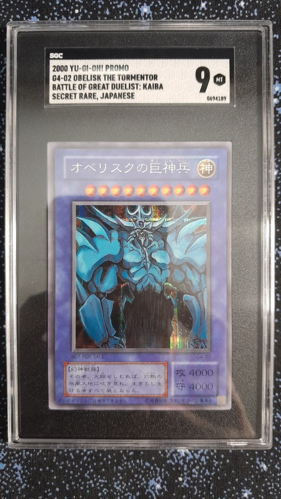 Up for sale is a highly sought-after Japanese Secret Rare Obelisk The Tormentor card from the Yu-Gi-Oh! TCG. This card was part of the 2000 Yugi promo G4-02 set and is in SGC 9 condition. It features a Reverse Holo finish and is perfect for collectors or avid players. The card is a Monster type and belongs to the Creature/Monster Type category, and is also a Divine-Beast. This card is a must-have for any fan of the Yu-Gi-Oh! franchise.
