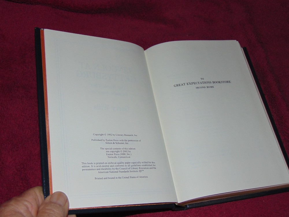 ORIGINAL 2002 LEATHER COVER COLLECTOR'S EDITION EASTON PRESS BOOK: "LINCOLN AT GETTYSBURG" (THE WORDS THAT REMADE AMERICA) BY GARY WILLIS .................. 317 CLEAN, TIGHTLY-BOUND PAGES ....................... MEASURES 6 1/2" X 9 1/2" .................. GOLD-GILT EDGES ........................ OVERALL VERY GOOD, SOLID CONDITION. ----------------------------------------- WILL BE SECURELY SHIPPED IN CARDBOARD FOR A SAFE JOURNEY TO YOUR HOME.