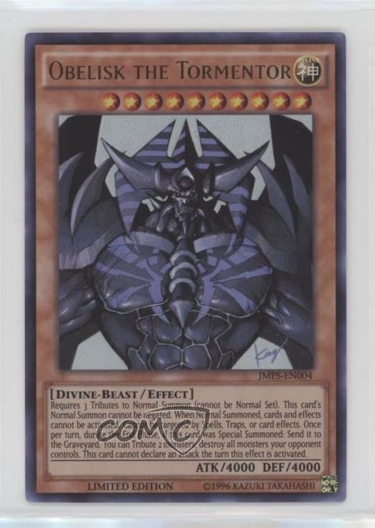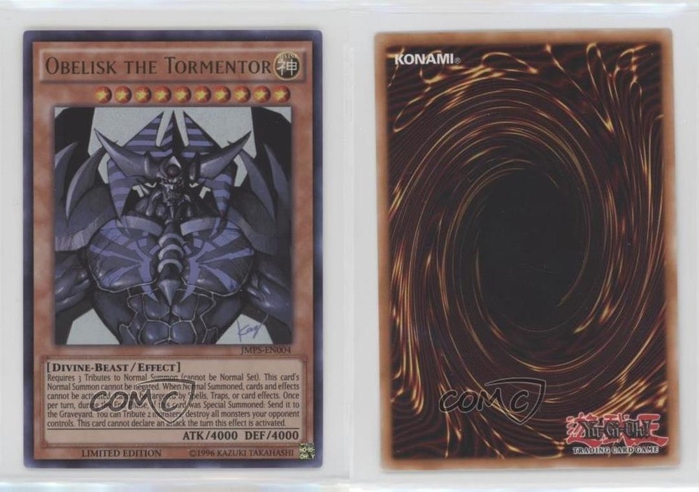 2002-19 Yu-Gi-Oh! Shonen Jump - Magazine Promo [Base] #JMPS-EN004 Obelisk the Tormentor COMC Item: 132954310 - YuGiOh Card - Featuring Obelisk the Tormentor Search for more: 2002-19 Yu-Gi-Oh! Shonen Jump Search for more: 2002-19 Yu-Gi-Oh! Shonen Jump - Magazine Promo [Base] View all of our Listings Auctions Buy It Now About Us Located in the beautiful Pacific Northwest, COMC (Check Out My Cards) is the world's largest consignment service for trading card singles. More than 10,000 people have used our consignment service to list over 50 million trading cards. Find out how we can help you consign your items on eBay by contacting us through eBay messaging. COMC -- "The Safe & Easy Way to Buy & Sell" Raw Condition for Modern Cards Unless otherwise noted, raw modern cards are listed in Near Mint-Mint condition or better. A NM-MT card appears to be Mint at first glance, but upon closer inspection, may exhibit some of the following: minor print defects (e.g. roller marks, print line, dimple), minor scratches, slight edge wear, and slight corner wear. Centering is clearly visible in the images provided and does not factor into our condition assessment. Raw Condition for Vintage Cards Unless otherwise noted, raw vintage cards are listed in Excellent condition or better. An EX card may exhibit some of the following: minor rounding of corners, surface wear, print defects, light scratches, and slight edge wear/chipping. Centering is clearly visible in the images provided and does not factor into our condition assessment. Domestic Shipping Combined shipping for multiple items is available. To receive combined shipping, please ensure all desired items are in your eBay shopping cart before proceeding to checkout. eBay limits orders to 40 items per order. We automatically combine multiple orders placed on the same day. If you place multiple orders on the same day, please contact us to request a refund of applicable shipping costs. Signature confirmation may be required on invoices over $400. All cards are protected and shipped securely. International Shipping COMC offers eBay's International Shipping (EIS) for international orders under $2,500* (see country exceptions below). All duties and import fees are paid at checkout; in the rare event that there are additional import fees upon delivery, these are borne by the buyer. EIS packages route through a shipping hub in Erlanger, KY before shipping to their final destination. Please note that EIS does not allow for combined shipments. The shipping rates are determined by eBay and cannot be adjusted. *Maximum sale price exceptions: Colombia, Kuwait ($2,000); Taiwan ($1,539); Chile, Costa Rica, Guatemala, Honduras, Trinidad and Tobago ($1,000); Antigua and Barbuda, Aruba, Belize, Dominica, Grenada, Philippines, Saint Kitts and Nevis, Saint Lucia, Montserrat, Turks and Caicos Islands ($500); Dominican Republic, El Salvador ($200). Please request a shipping quote through eBay messaging for orders that exceed the maximum sale price supported by eBay's International Shipping. You will be responsible for all duties and import fees for international orders shipped outside the EIS. All cards are protected and shipped securely. Payment COMC does not accept offers on our cards through our eBay storefront. COMC utilizes eBay’s managed payments system. If you are experiencing difficulties making a payment, please contact eBay for assistance. Return Policy Returns are only accepted on the rare occasion the item is not as described. If you are making a return, please initiate the return process through eBay so a mailing label can be provided for you. Prior to listing, our expert team carefully assessed this item to represent it accurately. Please review the description and high-definition images prior to purchasing to ensure this item meets your satisfaction. We welcome you to contact us if you have further questions about this item. Trust and Integrity COMC carefully assesses each item consigned to us to prevent fraudulent items from entering the marketplace. If you believe an item offered on COMC may be fraudulent, please contact us with details so we can investigate the issue. Items we determine are outside our supported items policy may be removed. Last Modified: 6/8/2025 9:11:14 AM PDT