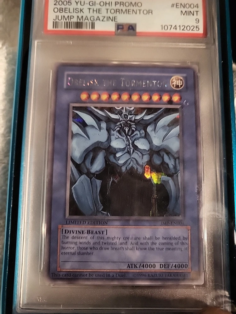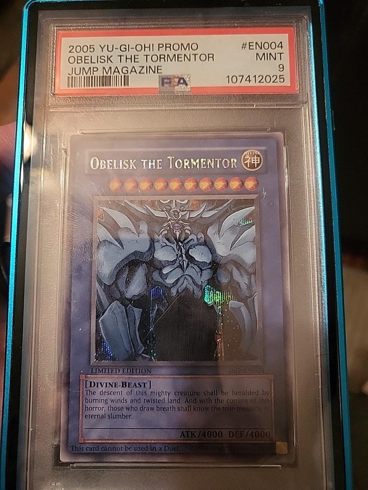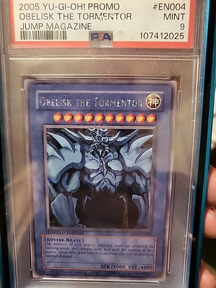 This Obelisk the Tormentor is a true collector's dream! The BGS 9.5 GEM M grade proves its flawless condition, and the iconic Jump Promo rarity makes it stand out. The artwork pops with that classic Secret Rare shine, and holding such a well-preserved piece of Yugioh history feels amazing. If you've been hunting for a premium-grade Obelisk, this is your chance—it doesn't get much better than this!