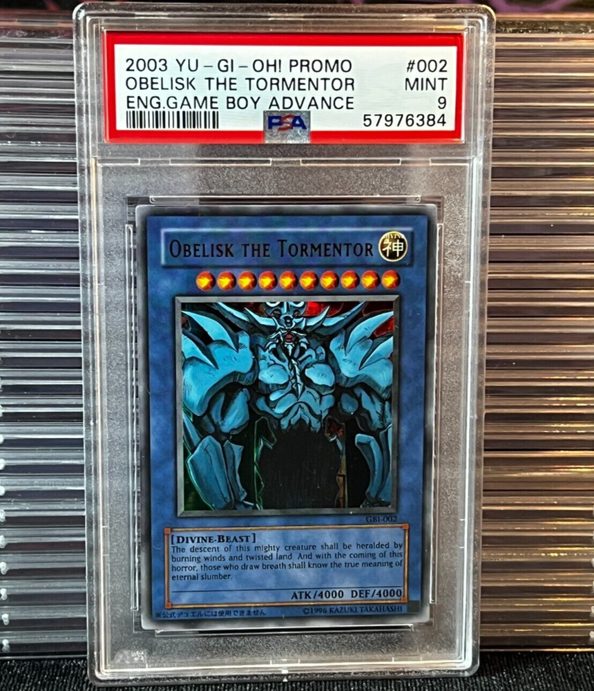 2003 Yu-Gi-Oh! Promo English Game Boy Advance Obelisk the Tormentor GBI-002 PSA 9 Divine Beast Level 10 Ultra Rare ATK / 4000 DEF / 4000 Shipping Cost with this listing includes insurance. CARDNATICS Please follow our store as we are continuing to list tens of thousands of cards, raw and graded. If you're looking for a certain sport, player, or card, please message us. We will look to see if we have what you're looking for and list it for you. Cardnatics makes no warranty that our raw cards are in a perfect 10 mint state condition. Most modern and ultra-modern cards will be in a just opened condition unless otherwise noted. Please view pictures carefully to see condition as listings photos will be of exact card for sale, unless under $4.99 in which the photo will represent the overall condition of the cards. Don’t hesitate to ask for additional photos if you’d like. SHIPPING Graded Cards will Ship BMWT All raw cards are shipped with penny sleeve and top loader. Top loaders are not guaranteed to be new but will be provided. All single, non-graded card listings that quality, will ship via Standard Shipping (eBay Standard Envelope for Trading Cards, up to $20 value). Ground Advantage Shipping Also Available with BMWT if you prefer. Combine Shipping available for most listings, however if the shipment exceeds the Standard Shipping $20 value or size restrictions, additional fees may be required to change shipping services. For combined shipping, we will first look to upgrade shipping service, and if excessive overpayment of shipping charges occur, we'll issue a partial shipping refund if upgrade is not available. RETURNS Cardnatics does not allow for returns unless item(s) received do not match the item description.