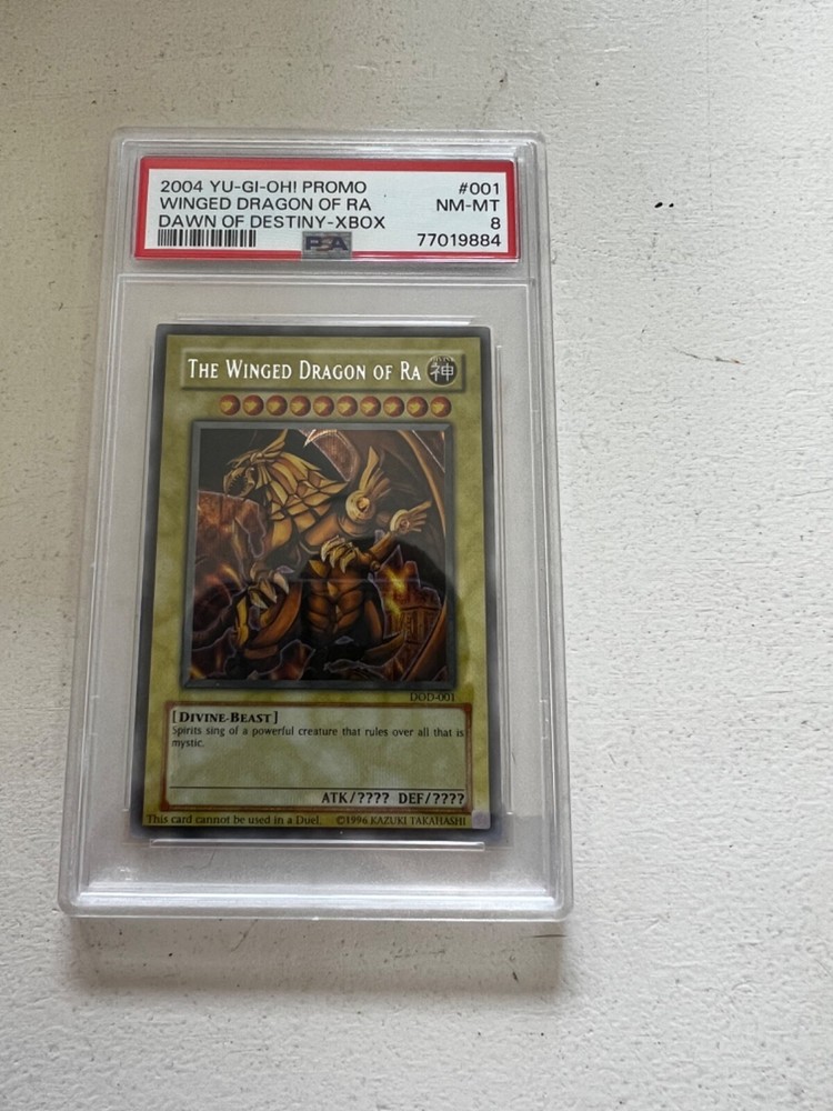This 2004 Yu-Gi-Oh! TCG card features The Winged Dragon of Ra character, an ancient animal creature type, and belongs to the Yu-Gi-Oh! The Dawn of Destiny Promotional Cards set. The card is of standard size and is an Amazing Rare with a certification number of 77019884. The Winged Dragon of Ra card is a Divine Beast type and was manufactured by Konami in the United States.This rare and vintage card is graded PSA 8 and has a professional grader code of 275010. It features the Xbox Promo and includes the English language. The Yu-Gi-Oh! TCG card is suitable for age level 4+ and is a great addition to any collector's collection.