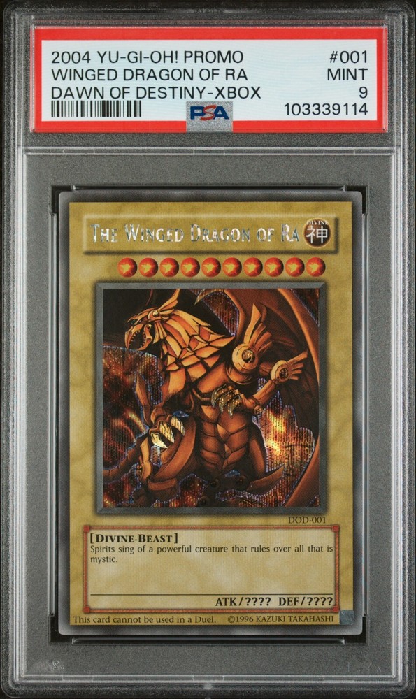 Elevate your Yu-Gi-Oh! TCG collection with the iconic Winged Dragon Of Ra from the Dawn Of Destiny Promotional Cards set. This Secret Rare monster card, DOD-001, boasts a striking holographic finish that encapsulates the essence of its divine attribute. A must-have for duelists and collectors alike, the card features the legendary creature/monster type Holy Dragon, depicted in exquisite detail.Crafted by Konami in 2004, this card has stood the test of time, maintaining its prestige and power within the game's lore. The Winged Dragon Of Ra comes in English language and is certified by PSA with a commendable grade of 9, ensuring its quality and authenticity for years to come. This promo card is an enduring symbol of strategic gameplay and a cherished piece of Yu-Gi-Oh! history.