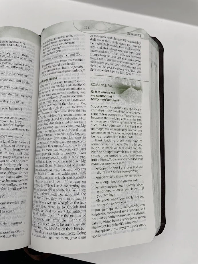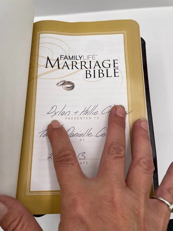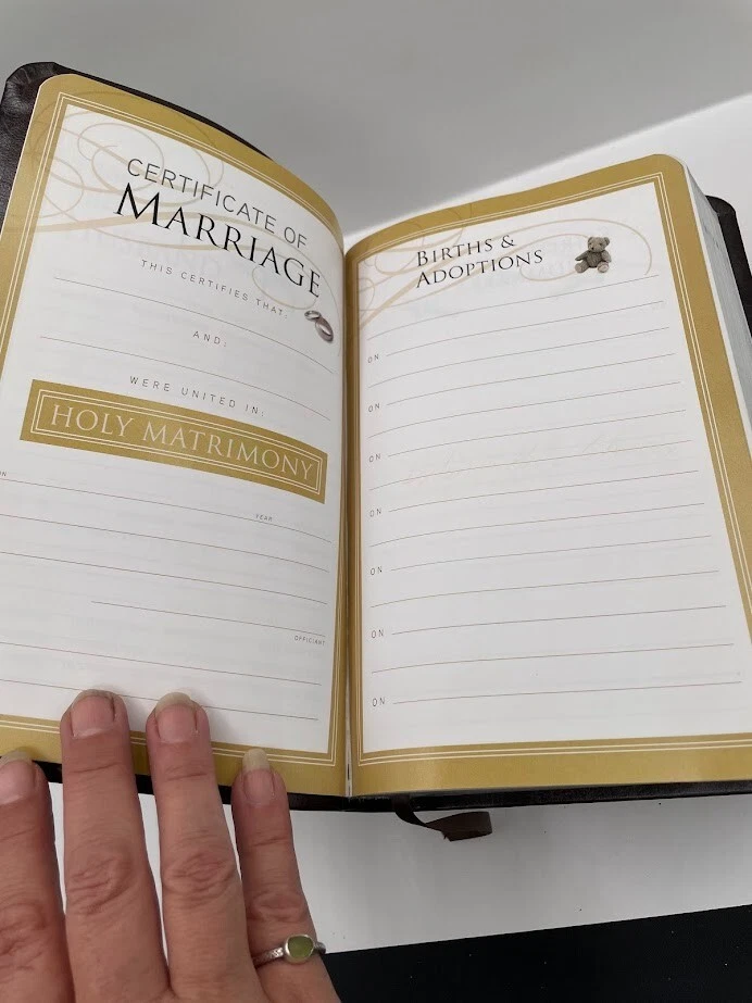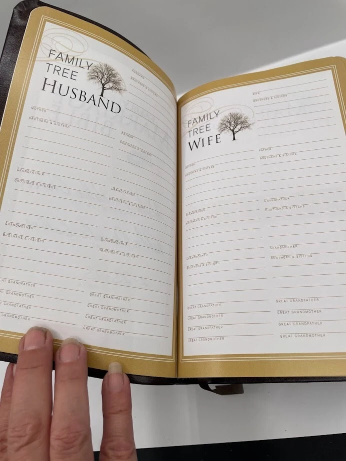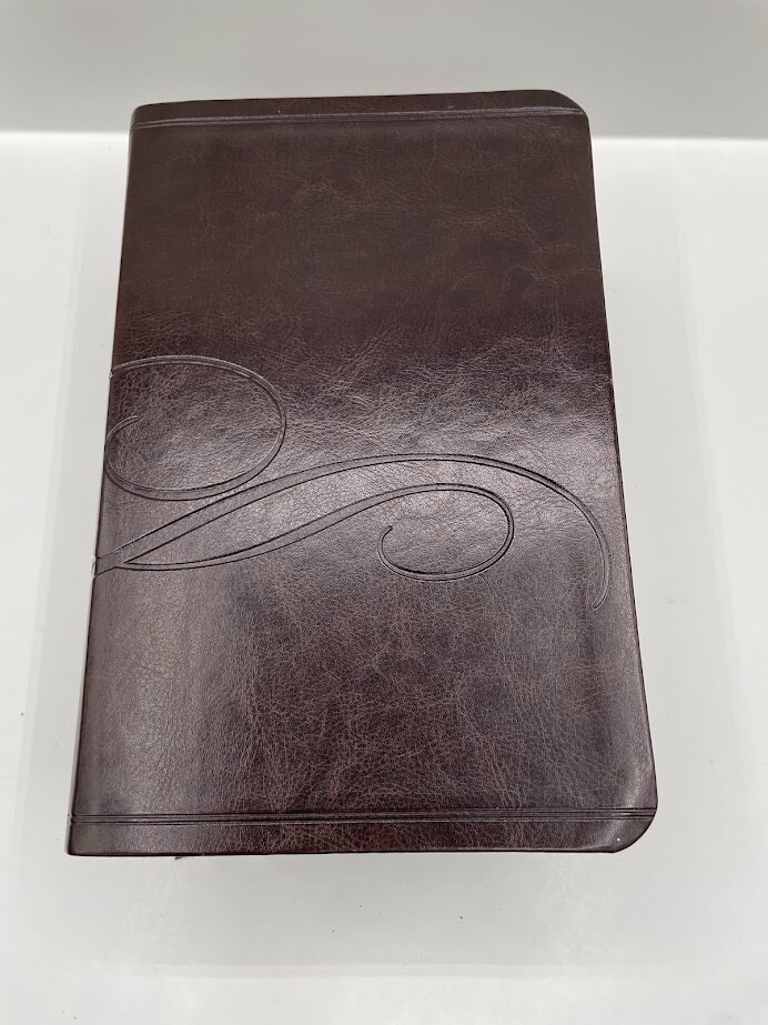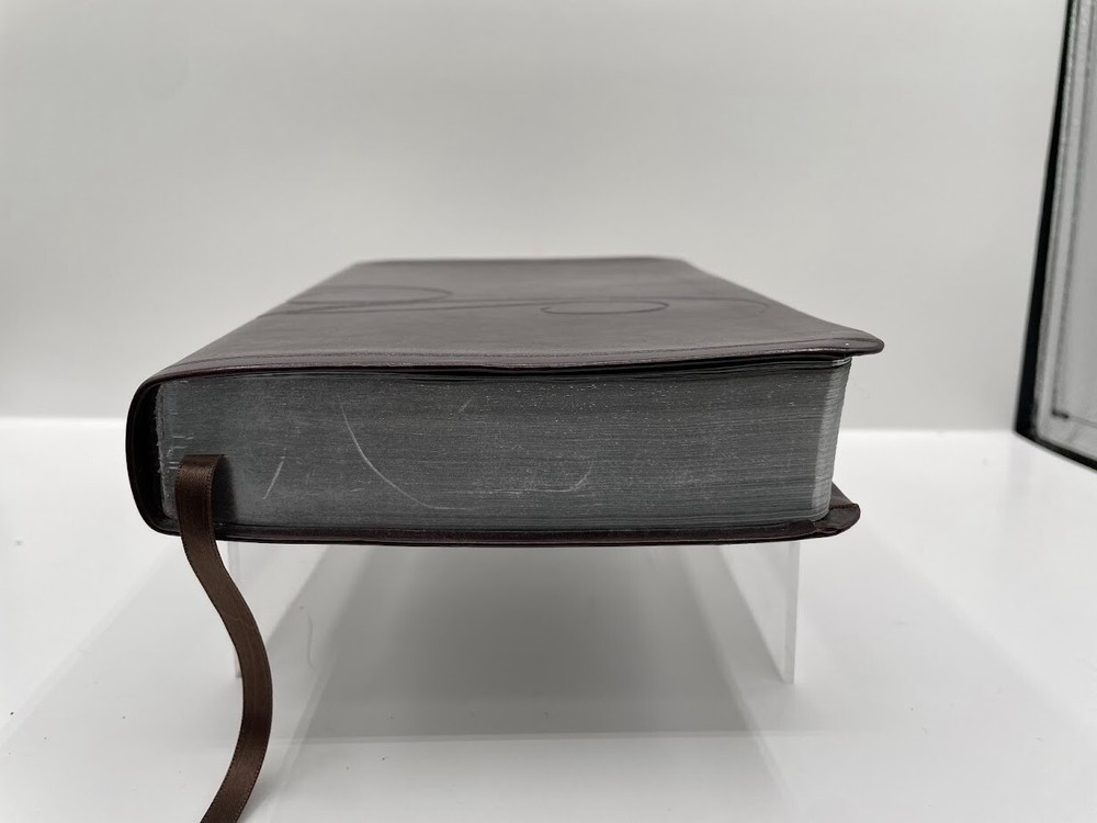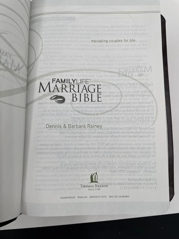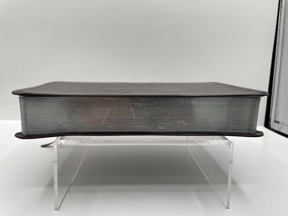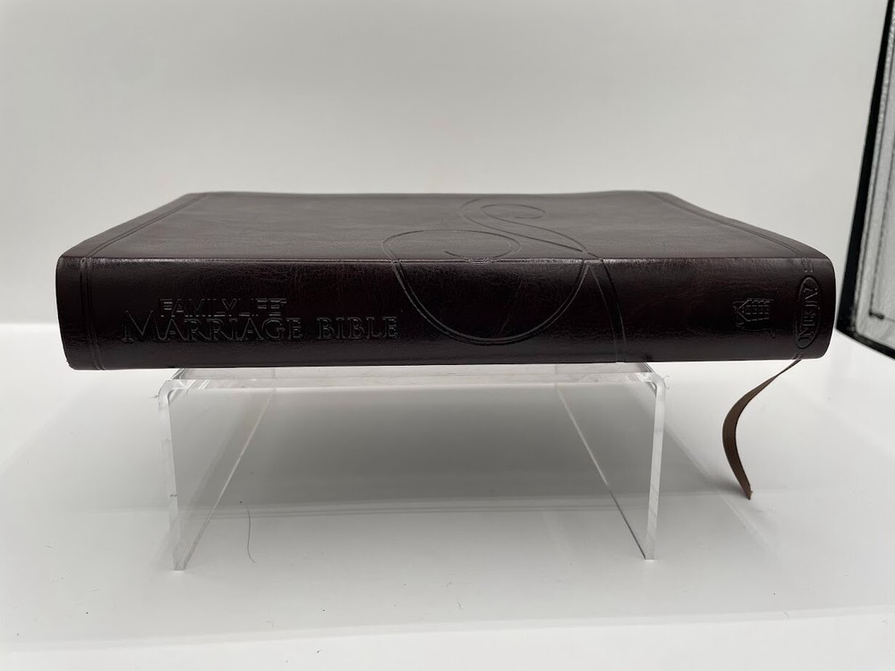 2007 Family Life Marriage Bible Brown Faux Leather Soft Bound Silver Edge Measures 8.5"L x 6"W x 1.5"D Does have names/date written on the dedication page but no other writing on the rest of the pages...