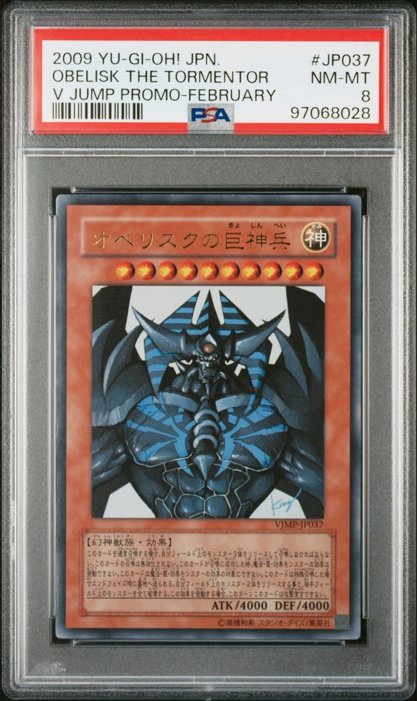 2009 YU-GI-OH! JAPANESE V JUMP PROMO FEBRUARY #JP037 OBELISK THE TORMENTOR PSA 8 2009 YU-GI-OH! JAPANESE V JUMP PROMO FEBRUARY #JP037 OBELISK THE TORMENTOR PSA 8 Purchase Info Thank you for your interest in this item consigned with PSA! By purchasing or making an offer on this item, you acknowledge and agree to the following terms: All sales are final. Returns not accepted. Payment must be made upon purchase of the item. All items are sold "as is" and without warranty of Collectors Universe, Inc. (d/b/a PSA), and ANY AND ALL IMPLIED WARRANTIES ARE DISCLAIMED AND EXCLUDED. Sales tax may apply depending on shipping address. PSA does not guarantee that another third-party grading company's authentication or certification of an item as genuine is correct or accurate. Neither a difference of opinion between third-party grading companies about authenticity, nor a company's subsequent reversal of its earlier authentication or certification of an item, will be a basis for rescinding a sale. Any dispute with another third-party grading company relating to the authenticity of an item must be resolved directly with that other company. Collectors' maximum liability in the event of loss or damage to an item during shipping will be the lesser of (a) the price paid for the item and (b) the change in fair market value of the item. You release Collectors from all other liability including for any claims of punitive damages, emotional distress, consequential damages, lost profits, or lost interest, except as prohibited by law. Shipping Purchased Items will be shipped directly from PSA Vault. You stay hands-free. PSA Vault When you purchase this item, you can save on sales tax and selling fees by keeping it in the PSA Vault, official Vault of eBay. Items already in PSA Vault and will be sent to PSA Vault will have no shipping charge Storage of any items with the PSA Vault will be subject to the PSA Vault Terms of Service. Consignment PSA has competitive rates on the world's largest collectibles marketplace with the option to list from the PSA Vault or immediately after PSA authentication and grading. Sale Price Under $100 $100 - $499 $500 - $999 $1,000 - $2,499 $2,500 - $4,999 $5,000+ Seller Fee 16% 14% 13% 10% 9% 7% Sellers pay a single fee as reflected above; no additional eBay fees are incurred. There is a $5 minimum fee on sold items.