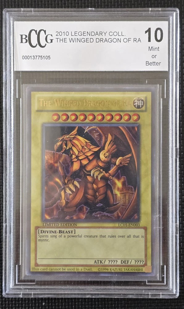 Elevate your Yu-Gi-Oh! TCG collection with the iconic The Winged Dragon of Ra from the Legendary Collection. This card is a must-have for enthusiasts and serious collectors alike, featuring the powerful and revered Dragon creature type in a stunning Holo finish. With its attributes rooted in divinity, this Ultra Rare card is a standout piece, reflecting the game's rich lore and strategic depth. Card #LC01-EN003 is not simply a collectible but a testament to the quality and craftsmanship of Konami. Graded BCCG MINT 10, it exemplifies pristine card stock material and standard size dimensions. Suitable for those aged 10 and above, it's a limited edition treasure that encapsulates the spirit of the game.
