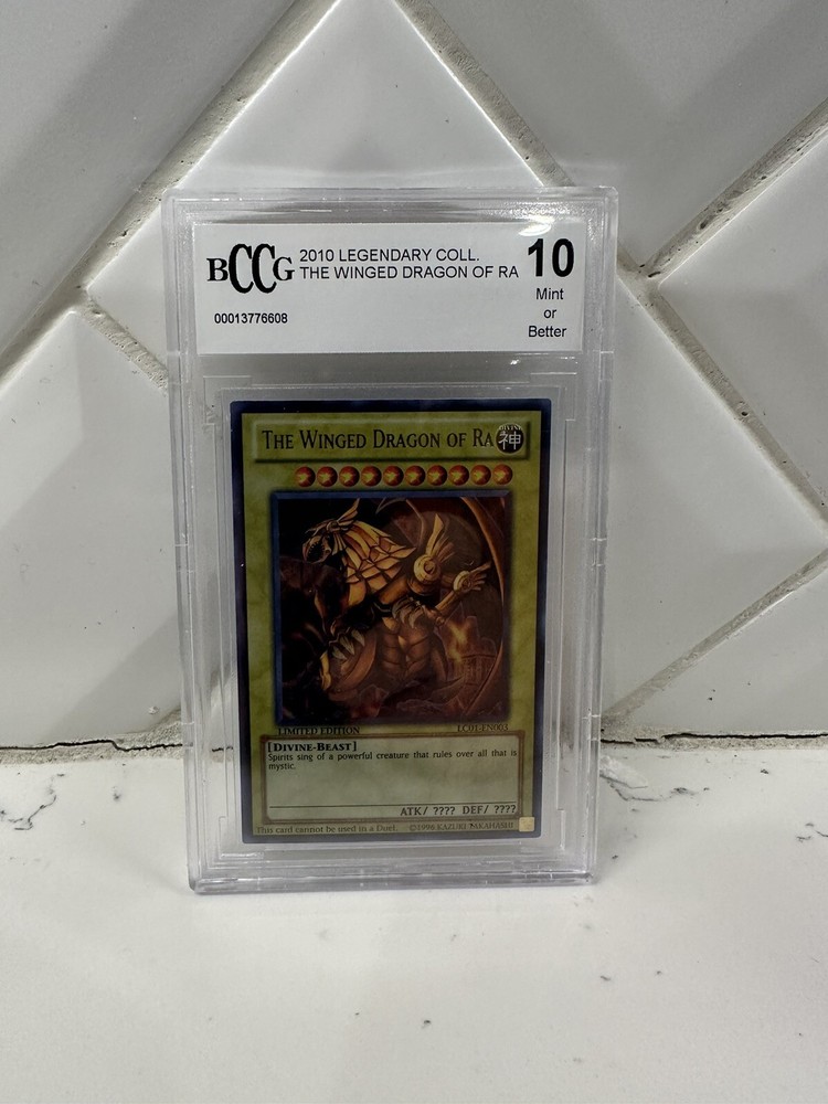 This is a rare and highly sought-after card from the 2010 Legendary Collection. The winged dragon of Ra is a powerful and iconic card that is sure to impress any Yu-Gi-Oh! TCG collector. It has been professionally graded by BCCG and received a perfect score of 10 Mint, making it a valuable addition to any collection. The card is part of the CCG Individual Cards category and is a must-have for fans of the game. It comes from the popular Legendary Collection set and is a great investment for any collector looking to add a rare card to their collection. Don't miss out on the opportunity to own this incredible card.