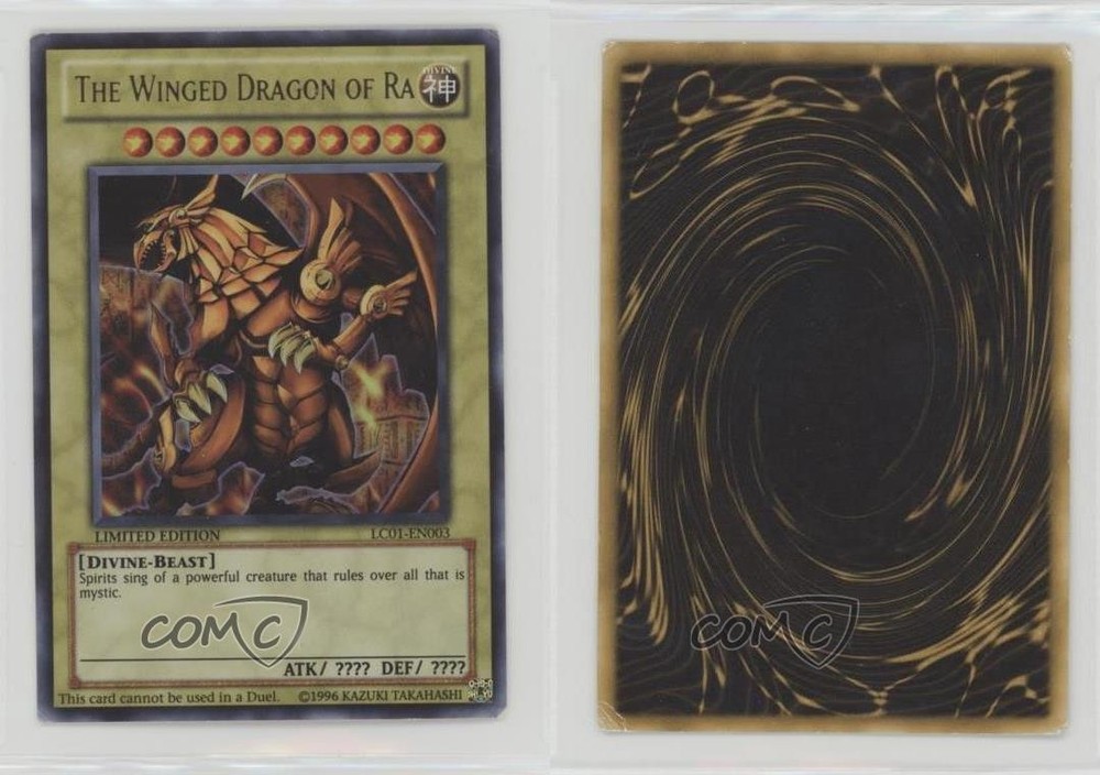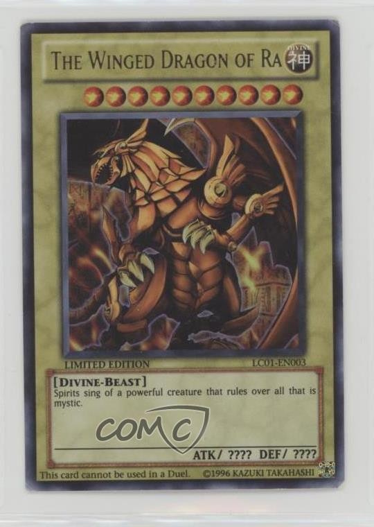2010 Yu-Gi-Oh! Legendary Collection 1 - Box Set [Base] - Limited Edition #LC01-EN003 The Winged Dragon of Ra COMC Item: 259219402 - YuGiOh Card - Featuring The Winged Dragon of Ra Search for more: 2010 Yu-Gi-Oh! Legendary Collection 1 Search for more: 2010 Yu-Gi-Oh! Legendary Collection 1 - Box Set [Base] - Limited Edition View all of our Listings Auctions Buy It Now About Us Located in the beautiful Pacific Northwest, COMC (Check Out My Cards) is the world's largest consignment service for trading card singles. More than 10,000 people have used our consignment service to list over 50 million trading cards. Find out how we can help you consign your items on eBay by contacting us through eBay messaging. COMC -- "The Safe & Easy Way to Buy & Sell" Raw Condition for Modern Cards Unless otherwise noted, raw modern cards are listed in Near Mint-Mint condition or better. A NM-MT card appears to be Mint at first glance, but upon closer inspection, may exhibit some of the following: minor print defects (e.g. roller marks, print line, dimple), minor scratches, slight edge wear, and slight corner wear. Centering is clearly visible in the images provided and does not factor into our condition assessment. Raw Condition for Vintage Cards Unless otherwise noted, raw vintage cards are listed in Excellent condition or better. An EX card may exhibit some of the following: minor rounding of corners, surface wear, print defects, light scratches, and slight edge wear/chipping. Centering is clearly visible in the images provided and does not factor into our condition assessment. Domestic Shipping Combined shipping for multiple items is available. To receive combined shipping, please ensure all desired items are in your eBay shopping cart before proceeding to checkout. eBay limits orders to 40 items per order. We automatically combine multiple orders placed on the same day. If you place multiple orders on the same day, please contact us to request a refund of applicable shipping costs. Signature confirmation may be required on invoices over $400. All cards are protected and shipped securely. International Shipping COMC offers eBay's International Shipping (EIS) for international orders under $2,500* (see country exceptions below). All duties and import fees are paid at checkout; in the rare event that there are additional import fees upon delivery, these are borne by the buyer. EIS packages route through a shipping hub in Erlanger, KY before shipping to their final destination. Please note that EIS does not allow for combined shipments. The shipping rates are determined by eBay and cannot be adjusted. *Maximum sale price exceptions: Colombia, Kuwait ($2,000); Taiwan ($1,539); Chile, Costa Rica, Guatemala, Honduras, Trinidad and Tobago ($1,000); Antigua and Barbuda, Aruba, Belize, Dominica, Grenada, Philippines, Saint Kitts and Nevis, Saint Lucia, Montserrat, Turks and Caicos Islands ($500); Dominican Republic, El Salvador ($200). Please request a shipping quote through eBay messaging for orders that exceed the maximum sale price supported by eBay's International Shipping. You will be responsible for all duties and import fees for international orders shipped outside the EIS. All cards are protected and shipped securely. Payment COMC does not accept offers on our cards through our eBay storefront. COMC utilizes eBay’s managed payments system. If you are experiencing difficulties making a payment, please contact eBay for assistance. Return Policy Returns are only accepted on the rare occasion the item is not as described. If you are making a return, please initiate the return process through eBay so a mailing label can be provided for you. Prior to listing, our expert team carefully assessed this item to represent it accurately. Please review the description and high-definition images prior to purchasing to ensure this item meets your satisfaction. We welcome you to contact us if you have further questions about this item. Trust and Integrity COMC carefully assesses each item consigned to us to prevent fraudulent items from entering the marketplace. If you believe an item offered on COMC may be fraudulent, please contact us with details so we can investigate the issue. Items we determine are outside our supported items policy may be removed. Last Modified: 5/6/2025 7:39:40 AM PDT