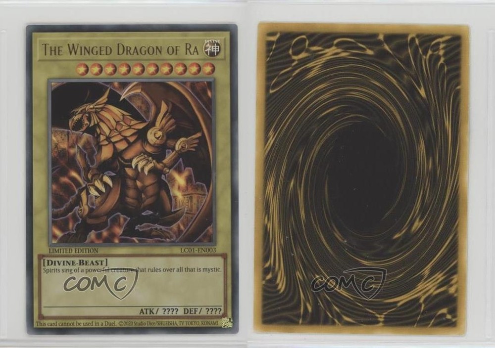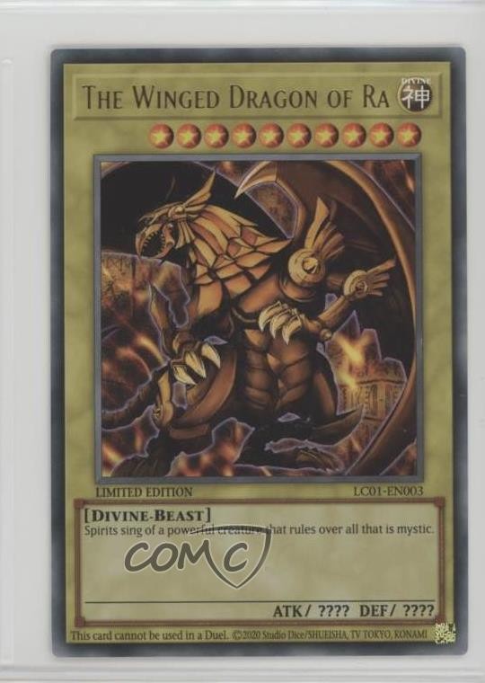 2010 Yu-Gi-Oh! Legendary Collection 1 - Box Set [Base] - Limited Edition #LC01-EN003 The Winged Dragon of Ra COMC Item: 225175858 - YuGiOh Card - Featuring The Winged Dragon of Ra Search for more: 2010 Yu-Gi-Oh! Legendary Collection 1 Search for more: 2010 Yu-Gi-Oh! Legendary Collection 1 - Box Set [Base] - Limited Edition View all of our Listings Auctions Buy It Now About Us Located in the beautiful Pacific Northwest, COMC (Check Out My Cards) is the world's largest consignment service for trading card singles. More than 10,000 people have used our consignment service to list over 50 million trading cards. Find out how we can help you consign your items on eBay by contacting us through eBay messaging. COMC -- "The Safe & Easy Way to Buy & Sell" Raw Condition for Modern Cards Unless otherwise noted, raw modern cards are listed in Near Mint-Mint condition or better. A NM-MT card appears to be Mint at first glance, but upon closer inspection, may exhibit some of the following: minor print defects (e.g. roller marks, print line, dimple), minor scratches, slight edge wear, and slight corner wear. Centering is clearly visible in the images provided and does not factor into our condition assessment. Raw Condition for Vintage Cards Unless otherwise noted, raw vintage cards are listed in Excellent condition or better. An EX card may exhibit some of the following: minor rounding of corners, surface wear, print defects, light scratches, and slight edge wear/chipping. Centering is clearly visible in the images provided and does not factor into our condition assessment. Domestic Shipping Combined shipping for multiple items is available. To receive combined shipping, please ensure all desired items are in your eBay shopping cart before proceeding to checkout. eBay limits orders to 40 items per order. We automatically combine multiple orders placed on the same day. If you place multiple orders on the same day, please contact us to request a refund of applicable shipping costs. Signature confirmation may be required on invoices over $400. All cards are protected and shipped securely. International Shipping COMC offers eBay's International Shipping (EIS) for international orders under $2,500* (see country exceptions below). All duties and import fees are paid at checkout; in the rare event that there are additional import fees upon delivery, these are borne by the buyer. EIS packages route through a shipping hub in Erlanger, KY before shipping to their final destination. Please note that EIS does not allow for combined shipments. The shipping rates are determined by eBay and cannot be adjusted. *Maximum sale price exceptions: Colombia, Kuwait ($2,000); Taiwan ($1,539); Chile, Costa Rica, Guatemala, Honduras, Trinidad and Tobago ($1,000); Antigua and Barbuda, Aruba, Belize, Dominica, Grenada, Philippines, Saint Kitts and Nevis, Saint Lucia, Montserrat, Turks and Caicos Islands ($500); Dominican Republic, El Salvador ($200). Please request a shipping quote through eBay messaging for orders that exceed the maximum sale price supported by eBay's International Shipping. You will be responsible for all duties and import fees for international orders shipped outside the EIS. All cards are protected and shipped securely. Payment COMC does not accept offers on our cards through our eBay storefront. COMC utilizes eBay’s managed payments system. If you are experiencing difficulties making a payment, please contact eBay for assistance. Return Policy Returns are only accepted on the rare occasion the item is not as described. If you are making a return, please initiate the return process through eBay so a mailing label can be provided for you. Prior to listing, our expert team carefully assessed this item to represent it accurately. Please review the description and high-definition images prior to purchasing to ensure this item meets your satisfaction. We welcome you to contact us if you have further questions about this item. Trust and Integrity COMC carefully assesses each item consigned to us to prevent fraudulent items from entering the marketplace. If you believe an item offered on COMC may be fraudulent, please contact us with details so we can investigate the issue. Items we determine are outside our supported items policy may be removed. Last Modified: 6/15/2025 7:07:09 AM PDT