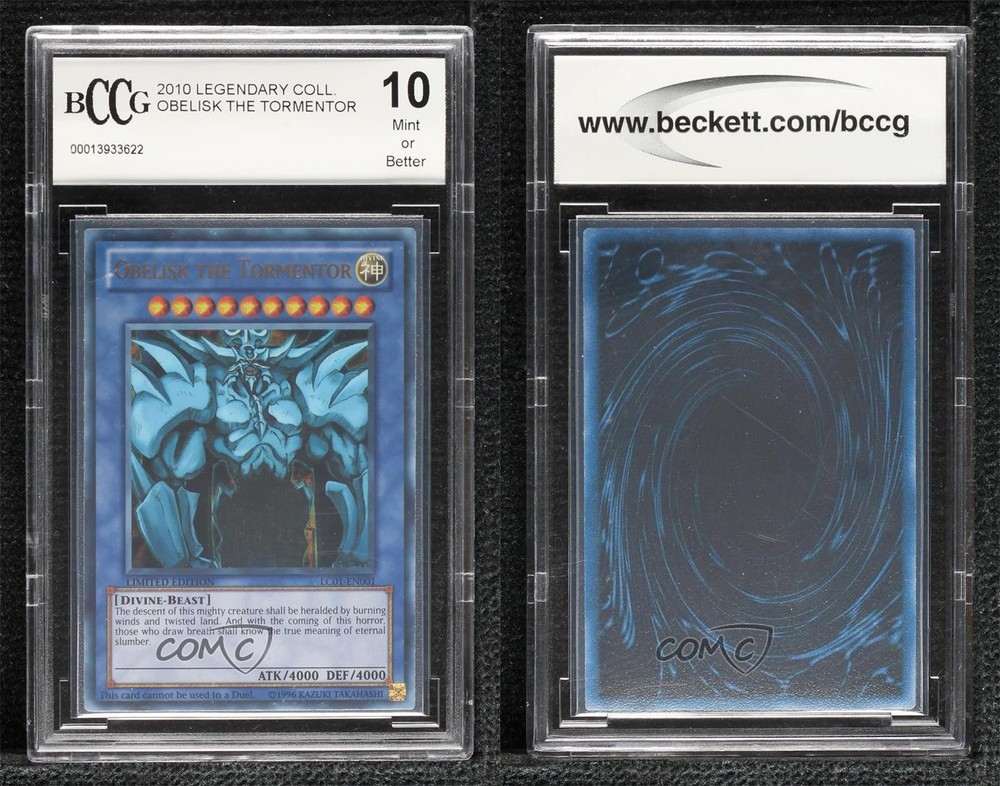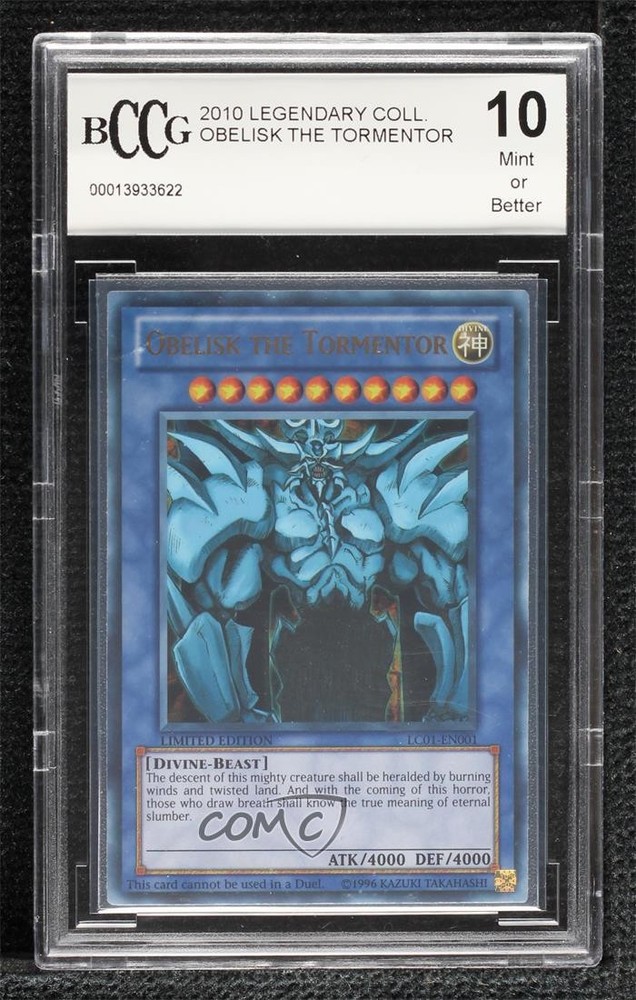 2010 Yu-Gi-Oh! Legendary Collection 1 - Box Set [Base] - Limited Edition #LC01-EN001 Obelisk the Tormentor Graded BCCG 10 Mint or Better COMC Item: 185128697 - YuGiOh Card - Featuring Obelisk the Tormentor Search for more: 2010 Yu-Gi-Oh! Legendary Collection 1 Search for more: 2010 Yu-Gi-Oh! Legendary Collection 1 - Box Set [Base] - Limited Edition View all of our Listings Auctions Buy It Now About Us Located in the beautiful Pacific Northwest, COMC (Check Out My Cards) is the world's largest consignment service for trading card singles. More than 10,000 people have used our consignment service to list over 50 million trading cards. Find out how we can help you consign your items on eBay by contacting us through eBay messaging. COMC -- "The Safe & Easy Way to Buy & Sell" Raw Condition for Modern Cards Unless otherwise noted, raw modern cards are listed in Near Mint-Mint condition or better. A NM-MT card appears to be Mint at first glance, but upon closer inspection, may exhibit some of the following: minor print defects (e.g. roller marks, print line, dimple), minor scratches, slight edge wear, and slight corner wear. Centering is clearly visible in the images provided and does not factor into our condition assessment. Raw Condition for Vintage Cards Unless otherwise noted, raw vintage cards are listed in Excellent condition or better. An EX card may exhibit some of the following: minor rounding of corners, surface wear, print defects, light scratches, and slight edge wear/chipping. Centering is clearly visible in the images provided and does not factor into our condition assessment. Domestic Shipping Combined shipping for multiple items is available. To receive combined shipping, please ensure all desired items are in your eBay shopping cart before proceeding to checkout. eBay limits orders to 40 items per order. We automatically combine multiple orders placed on the same day. If you place multiple orders on the same day, please contact us to request a refund of applicable shipping costs. Signature confirmation may be required on invoices over $400. All cards are protected and shipped securely. International Shipping COMC offers eBay's International Shipping (EIS) for international orders under $2,500* (see country exceptions below). All duties and import fees are paid at checkout; in the rare event that there are additional import fees upon delivery, these are borne by the buyer. EIS packages route through a shipping hub in Erlanger, KY before shipping to their final destination. Please note that EIS does not allow for combined shipments. The shipping rates are determined by eBay and cannot be adjusted. *Maximum sale price exceptions: Colombia, Kuwait ($2,000); Taiwan ($1,539); Chile, Costa Rica, Guatemala, Honduras, Trinidad and Tobago ($1,000); Antigua and Barbuda, Aruba, Belize, Dominica, Grenada, Philippines, Saint Kitts and Nevis, Saint Lucia, Montserrat, Turks and Caicos Islands ($500); Dominican Republic, El Salvador ($200). Please request a shipping quote through eBay messaging for orders that exceed the maximum sale price supported by eBay's International Shipping. You will be responsible for all duties and import fees for international orders shipped outside the EIS. All cards are protected and shipped securely. Payment COMC does not accept offers on our cards through our eBay storefront. COMC utilizes eBay’s managed payments system. If you are experiencing difficulties making a payment, please contact eBay for assistance. Return Policy Returns are only accepted on the rare occasion the item is not as described. If you are making a return, please initiate the return process through eBay so a mailing label can be provided for you. Prior to listing, our expert team carefully assessed this item to represent it accurately. Please review the description and high-definition images prior to purchasing to ensure this item meets your satisfaction. We welcome you to contact us if you have further questions about this item. Trust and Integrity COMC carefully assesses each item consigned to us to prevent fraudulent items from entering the marketplace. If you believe an item offered on COMC may be fraudulent, please contact us with details so we can investigate the issue. Items we determine are outside our supported items policy may be removed. Last Modified: 5/6/2025 7:39:15 AM PDT