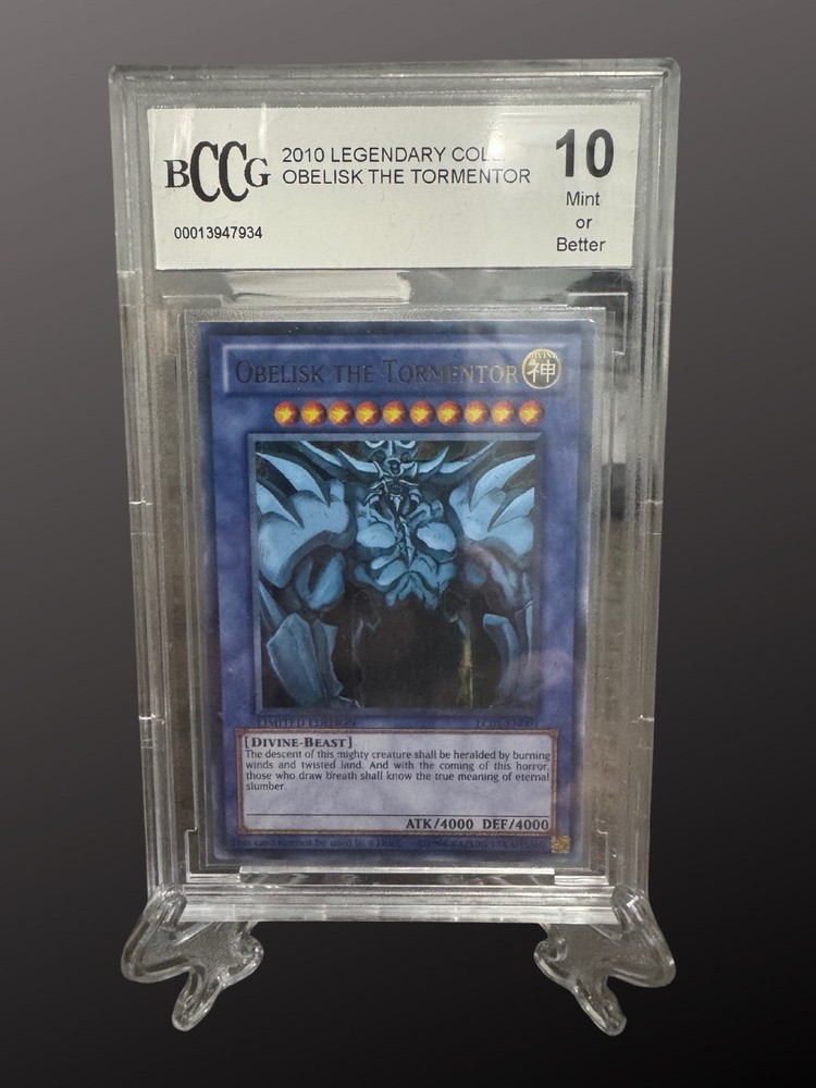 This limited edition Obelisk the Tormentor card from the 2010 Yu-Gi-Oh! Legendary Collection is a must-have for any serious collector. With its ultra rare status and original design by Konami, this card is a true gem. The card is in English and has been graded as a 10, making it the perfect addition to any collection. The card features the powerful player/athlete, Obelisk the Tormentor, and is part of the Yu-Gi-Oh! TCG game. The card manufacturer is Konami and it is a single parallel product. The season is 2010 and the card is in the Toys & Hobbies and Collectible Card Games categories. Don't miss out on the opportunity to own this rare card.