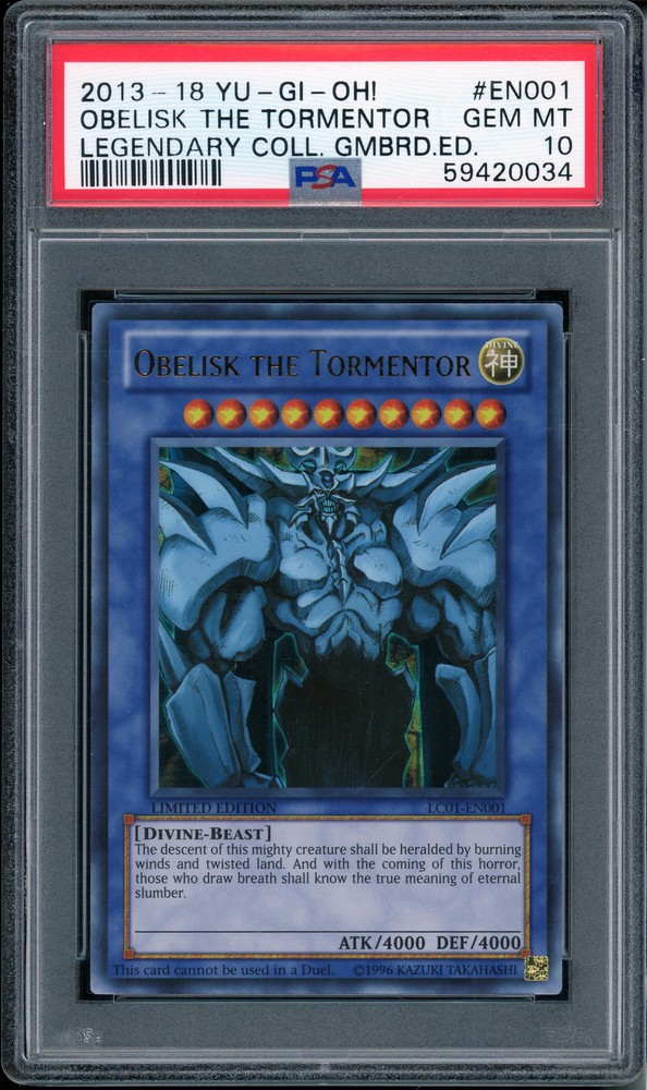 You are purchasing a 2013-2018 Yu-Gi-Oh! Legendary Collection Gameboard Edition Obelisk The Tormentor #LC01-EN001 PSA 10. You will receive the exact item in the photographs. Thank you for looking. Listed With Mascot .