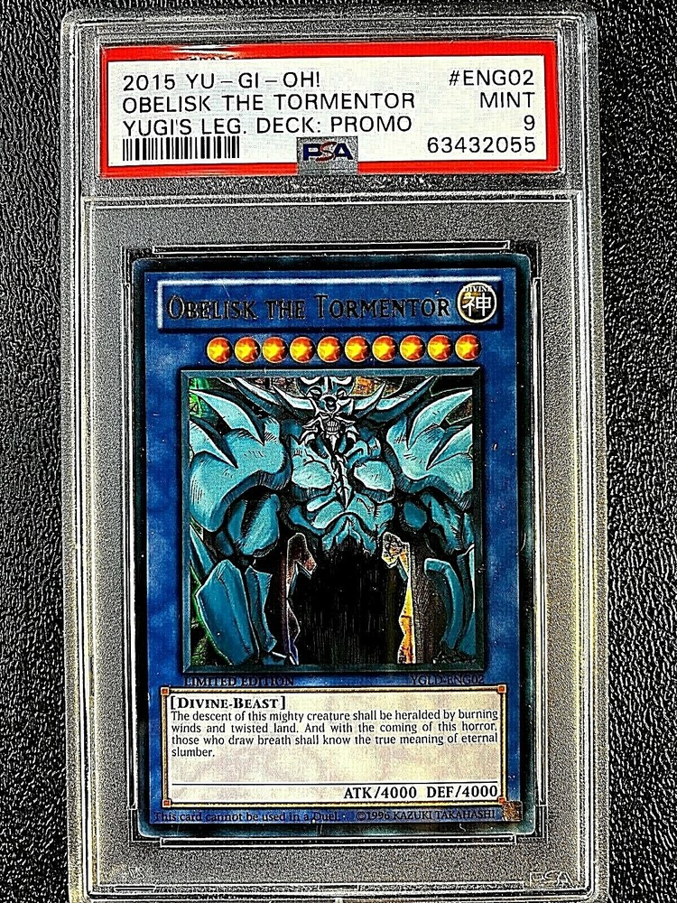 2015 Obelisk The Tormentor YUGI'S LEGENDARY DECK PROMO ENG02 PSA Mint 9 =GRD515= BEST PACKING ON EBAY GUARANTEED ig= card.addiction Items with multiple cards of the same card for sale are mailed out in random order , but are all within the same condition as show in the main picture. Add multiple cards to your shopping cart and or just request combined shipping at any time; 50 cents each additional single raw card and or 1 dollar each additional graded card. 10 dollars maximum shipping no matter how many cards you buy. Highest shipping cost plus .50 or $1.00 to a max of $10.00 SHIPPING, for trading cards only. JUST PURCHASE I WILL REFUND DIFFERENCE AFTER CHECK-OUT ; please give me time to respond and provide your refund of the shipping difference. If you have any questions what-so-ever please ask BEFORE you bid, not after. I OFFER NO GUARANTEES ON ANY RAW CARDS EXCEPT THAT YOU WILL GET THE EXACT CARD IN THE PICTURE, except when there are multiples of a card for sale. No shipping over the weekends and holidays. Payments made Friday’s after 9:00 am will be shipped on Mondays, as long as the post office is open. =#’s= at end of item description are for cataloging purposes only, for cross-referencing. I highly suggest LOW FEEDBACKERS to contact me prior to purchasing or be at risk of having your order canceled and being blocked. Track Page Views With Auctiva's Counter