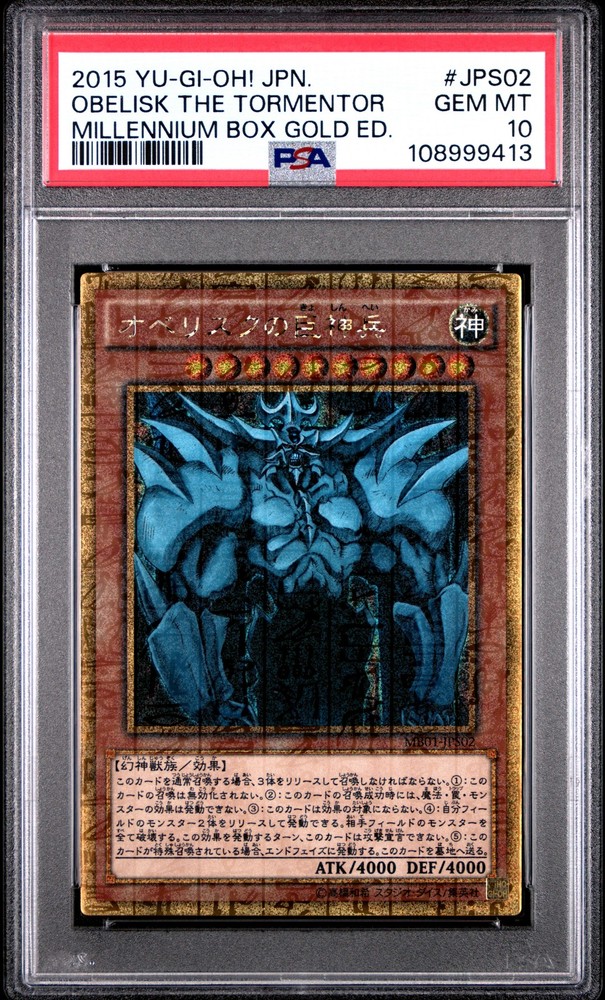 2015 YU-GI-OH! JAPANESE MB01-MILLENNIUM BOX GOLD EDITION #JPS02 OBELISK THE TORMENTOR PSA 10 2015 YU-GI-OH! JAPANESE MB01-MILLENNIUM BOX GOLD EDITION #JPS02 OBELISK THE TORMENTOR PSA 10 Purchase Info Thank you for your interest in bidding on this item consigned with PSA! By bidding on this item, you acknowledge and agree to the following terms: All sales are final. Returns not accepted. Payment must be made within 7 days of auction close. All items are sold "as is" and without warranty of Collectors Universe, Inc. (d/b/a PSA), and ANY AND ALL IMPLIED WARRANTIES ARE DISCLAIMED AND EXCLUDED. Sales tax may apply depending on shipping address. PSA does not guarantee that another third-party grading company's authentication or certification of an item as genuine is correct or accurate. Neither a difference of opinion between third-party grading companies about authenticity, nor a company's subsequent reversal of its earlier authentication or certification of an item, will be a basis for rescinding a sale. Any dispute with another third-party grading company relating to the authenticity of an item must be resolved directly with that other company. Collectors' maximum liability in the event of loss or damage to an item during shipping will be the lesser of (a) the price paid for the item and (b) the change in fair market value of the item. You release Collectors from all other liability including for any claims of punitive damages, emotional distress, consequential damages, lost profits, or lost interest, except as prohibited by law. Shipping Purchased Items will be shipped directly from PSA Vault. You stay hands-free. PSA Vault When you purchase this item, you can save on sales tax and selling fees by keeping it in the PSA Vault, official Vault of eBay. Items already in PSA Vault and will be sent to PSA Vault will have no shipping charge Storage of any items with the PSA Vault will be subject to the PSA Vault Terms of Service. Consignment PSA has competitive auction rates on the world's largest collectibles marketplace with the option to list from the PSA Vault or immediately after PSA authentication and grading. Sale Price Under $100 $100 - $499 $500 - $999 $1,000 - $2,499 $2,500 - $4,999 $5,000+ Seller Fee 13% + $3 flat 13% 12% 10% 9% 7% Sellers pay a single fee as reflected above; no additional eBay fees are incurred.