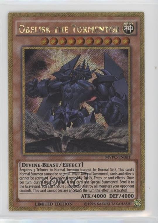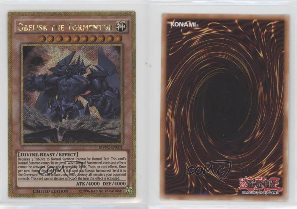 2016 Yu-Gi-Oh! The Dark Side of Dimensions - Movie Pack [Base] - Limited Edition #MVPC-EN001 Obelisk the Tormentor COMC Item: 132956320 - YuGiOh Card - Featuring Obelisk the Tormentor Search for more: 2016 Yu-Gi-Oh! The Dark Side of Dimensions Search for more: 2016 Yu-Gi-Oh! The Dark Side of Dimensions - Movie Pack [Base] - Limited Edition View all of our Listings Auctions Buy It Now About Us Located in the beautiful Pacific Northwest, COMC (Check Out My Cards) is the world's largest consignment service for trading card singles. More than 10,000 people have used our consignment service to list over 50 million trading cards. Find out how we can help you consign your items on eBay by contacting us through eBay messaging. COMC -- "The Safe & Easy Way to Buy & Sell" Raw Condition for Modern Cards Unless otherwise noted, raw modern cards are listed in Near Mint-Mint condition or better. A NM-MT card appears to be Mint at first glance, but upon closer inspection, may exhibit some of the following: minor print defects (e.g. roller marks, print line, dimple), minor scratches, slight edge wear, and slight corner wear. Centering is clearly visible in the images provided and does not factor into our condition assessment. Raw Condition for Vintage Cards Unless otherwise noted, raw vintage cards are listed in Excellent condition or better. An EX card may exhibit some of the following: minor rounding of corners, surface wear, print defects, light scratches, and slight edge wear/chipping. Centering is clearly visible in the images provided and does not factor into our condition assessment. Domestic Shipping Combined shipping for multiple items is available. To receive combined shipping, please ensure all desired items are in your eBay shopping cart before proceeding to checkout. eBay limits orders to 40 items per order. We automatically combine multiple orders placed on the same day. If you place multiple orders on the same day, please contact us to request a refund of applicable shipping costs. Signature confirmation may be required on invoices over $400. All cards are protected and shipped securely. International Shipping COMC offers eBay's International Shipping (EIS) for international orders under $2,500* (see country exceptions below). All duties and import fees are paid at checkout; in the rare event that there are additional import fees upon delivery, these are borne by the buyer. EIS packages route through a shipping hub in Erlanger, KY before shipping to their final destination. Please note that EIS does not allow for combined shipments. The shipping rates are determined by eBay and cannot be adjusted. *Maximum sale price exceptions: Colombia, Kuwait ($2,000); Taiwan ($1,539); Chile, Costa Rica, Guatemala, Honduras, Trinidad and Tobago ($1,000); Antigua and Barbuda, Aruba, Belize, Dominica, Grenada, Philippines, Saint Kitts and Nevis, Saint Lucia, Montserrat, Turks and Caicos Islands ($500); Dominican Republic, El Salvador ($200). Please request a shipping quote through eBay messaging for orders that exceed the maximum sale price supported by eBay's International Shipping. You will be responsible for all duties and import fees for international orders shipped outside the EIS. All cards are protected and shipped securely. Payment COMC does not accept offers on our cards through our eBay storefront. COMC utilizes eBay’s managed payments system. If you are experiencing difficulties making a payment, please contact eBay for assistance. Return Policy Returns are only accepted on the rare occasion the item is not as described. If you are making a return, please initiate the return process through eBay so a mailing label can be provided for you. Prior to listing, our expert team carefully assessed this item to represent it accurately. Please review the description and high-definition images prior to purchasing to ensure this item meets your satisfaction. We welcome you to contact us if you have further questions about this item. Trust and Integrity COMC carefully assesses each item consigned to us to prevent fraudulent items from entering the marketplace. If you believe an item offered on COMC may be fraudulent, please contact us with details so we can investigate the issue. Items we determine are outside our supported items policy may be removed. Last Modified: 6/8/2025 9:10:04 AM PDT