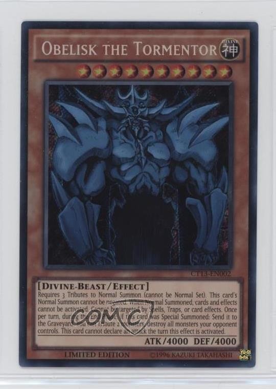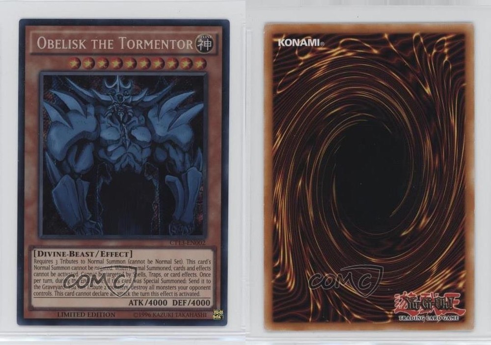 2016 Yu-Gi-Oh! Mega-Tins - Limited Edition [Base] #CT13-EN002 SCR - Obelisk the Tormentor COMC Item: 224686618 - YuGiOh Card - Featuring Obelisk the Tormentor Search for more: 2016 Yu-Gi-Oh! Mega-Tins Search for more: 2016 Yu-Gi-Oh! Mega-Tins - Limited Edition [Base] View all of our Listings Auctions Buy It Now About Us Located in the beautiful Pacific Northwest, COMC (Check Out My Cards) is the world's largest consignment service for trading card singles. More than 10,000 people have used our consignment service to list over 50 million trading cards. Find out how we can help you consign your items on eBay by contacting us through eBay messaging. COMC -- "The Safe & Easy Way to Buy & Sell" Raw Condition for Modern Cards Unless otherwise noted, raw modern cards are listed in Near Mint-Mint condition or better. A NM-MT card appears to be Mint at first glance, but upon closer inspection, may exhibit some of the following: minor print defects (e.g. roller marks, print line, dimple), minor scratches, slight edge wear, and slight corner wear. Centering is clearly visible in the images provided and does not factor into our condition assessment. Raw Condition for Vintage Cards Unless otherwise noted, raw vintage cards are listed in Excellent condition or better. An EX card may exhibit some of the following: minor rounding of corners, surface wear, print defects, light scratches, and slight edge wear/chipping. Centering is clearly visible in the images provided and does not factor into our condition assessment. Domestic Shipping Combined shipping for multiple items is available. To receive combined shipping, please ensure all desired items are in your eBay shopping cart before proceeding to checkout. eBay limits orders to 40 items per order. We automatically combine multiple orders placed on the same day. If you place multiple orders on the same day, please contact us to request a refund of applicable shipping costs. Signature confirmation may be required on invoices over $400. All cards are protected and shipped securely. International Shipping COMC offers eBay's International Shipping (EIS) for international orders under $2,500* (see country exceptions below). All duties and import fees are paid at checkout; in the rare event that there are additional import fees upon delivery, these are borne by the buyer. EIS packages route through a shipping hub in Erlanger, KY before shipping to their final destination. Please note that EIS does not allow for combined shipments. The shipping rates are determined by eBay and cannot be adjusted. *Maximum sale price exceptions: Colombia, Kuwait ($2,000); Taiwan ($1,539); Chile, Costa Rica, Guatemala, Honduras, Trinidad and Tobago ($1,000); Antigua and Barbuda, Aruba, Belize, Dominica, Grenada, Philippines, Saint Kitts and Nevis, Saint Lucia, Montserrat, Turks and Caicos Islands ($500); Dominican Republic, El Salvador ($200). Please request a shipping quote through eBay messaging for orders that exceed the maximum sale price supported by eBay's International Shipping. You will be responsible for all duties and import fees for international orders shipped outside the EIS. All cards are protected and shipped securely. Payment COMC does not accept offers on our cards through our eBay storefront. COMC utilizes eBay’s managed payments system. If you are experiencing difficulties making a payment, please contact eBay for assistance. Return Policy Returns are only accepted on the rare occasion the item is not as described. If you are making a return, please initiate the return process through eBay so a mailing label can be provided for you. Prior to listing, our expert team carefully assessed this item to represent it accurately. Please review the description and high-definition images prior to purchasing to ensure this item meets your satisfaction. We welcome you to contact us if you have further questions about this item. Trust and Integrity COMC carefully assesses each item consigned to us to prevent fraudulent items from entering the marketplace. If you believe an item offered on COMC may be fraudulent, please contact us with details so we can investigate the issue. Items we determine are outside our supported items policy may be removed. Last Modified: 5/25/2025 9:11:55 PM PDT