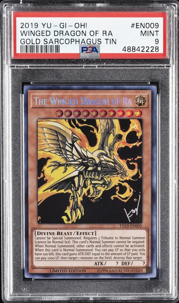 2019 YU-GI-OH! GOLD SARCOPHAGUS TIN #EN009 THE WINGED DRAGON OF RA PSA 9 2019 YU-GI-OH! GOLD SARCOPHAGUS TIN #EN009 THE WINGED DRAGON OF RA PSA 9 Purchase Info Thank you for your interest in this item consigned with PSA! By purchasing or making an offer on this item, you acknowledge and agree to the following terms: All sales are final. Returns not accepted. Payment must be made upon purchase of the item. All items are sold "as is" and without warranty of Collectors Universe, Inc. (d/b/a PSA), and ANY AND ALL IMPLIED WARRANTIES ARE DISCLAIMED AND EXCLUDED. Sales tax may apply depending on shipping address. PSA does not guarantee that another third-party grading company's authentication or certification of an item as genuine is correct or accurate. Neither a difference of opinion between third-party grading companies about authenticity, nor a company's subsequent reversal of its earlier authentication or certification of an item, will be a basis for rescinding a sale. Any dispute with another third-party grading company relating to the authenticity of an item must be resolved directly with that other company. Collectors' maximum liability in the event of loss or damage to an item during shipping will be the lesser of (a) the price paid for the item and (b) the change in fair market value of the item. You release Collectors from all other liability including for any claims of punitive damages, emotional distress, consequential damages, lost profits, or lost interest, except as prohibited by law. Shipping Purchased Items will be shipped directly from PSA Vault. You stay hands-free. PSA Vault When you purchase this item, you can save on sales tax and selling fees by keeping it in the PSA Vault, official Vault of eBay. Items already in PSA Vault and will be sent to PSA Vault will have no shipping charge Storage of any items with the PSA Vault will be subject to the PSA Vault Terms of Service. Consignment PSA has competitive rates on the world's largest collectibles marketplace with the option to list from the PSA Vault or immediately after PSA authentication and grading. Sale Price Under $100 $100 - $499 $500 - $999 $1,000 - $2,499 $2,500 - $4,999 $5,000+ Seller Fee 16% 14% 13% 10% 9% 7% Sellers pay a single fee as reflected above; no additional eBay fees are incurred. There is a $5 minimum fee on sold items.