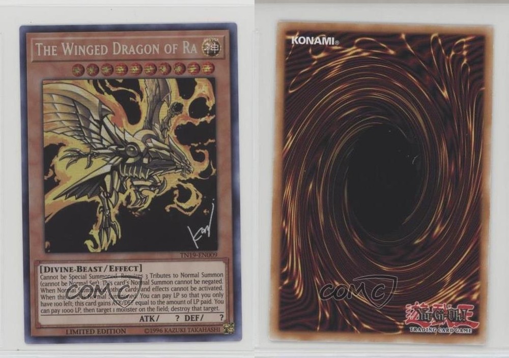 2019 Yu-Gi-Oh! Gold Sarcophagus Tin - [Base] - Limited Edition #TN19-EN009 Prismatic Secret Rare - The Winged Dragon of Ra COMC Item: 187366229 - YuGiOh Card - Featuring The Winged Dragon of Ra Search for more: 2019 Yu-Gi-Oh! Gold Sarcophagus Tin Search for more: 2019 Yu-Gi-Oh! Gold Sarcophagus Tin - [Base] - Limited Edition View all of our Listings Auctions Buy It Now About Us Located in the beautiful Pacific Northwest, COMC (Check Out My Cards) is the world's largest consignment service for trading card singles. More than 10,000 people have used our consignment service to list over 50 million trading cards. Find out how we can help you consign your items on eBay by contacting us through eBay messaging. COMC -- "The Safe & Easy Way to Buy & Sell" Raw Condition for Modern Cards Unless otherwise noted, raw modern cards are listed in Near Mint-Mint condition or better. A NM-MT card appears to be Mint at first glance, but upon closer inspection, may exhibit some of the following: minor print defects (e.g. roller marks, print line, dimple), minor scratches, slight edge wear, and slight corner wear. Centering is clearly visible in the images provided and does not factor into our condition assessment. Raw Condition for Vintage Cards Unless otherwise noted, raw vintage cards are listed in Excellent condition or better. An EX card may exhibit some of the following: minor rounding of corners, surface wear, print defects, light scratches, and slight edge wear/chipping. Centering is clearly visible in the images provided and does not factor into our condition assessment. Domestic Shipping Combined shipping for multiple items is available. To receive combined shipping, please ensure all desired items are in your eBay shopping cart before proceeding to checkout. eBay limits orders to 40 items per order. We automatically combine multiple orders placed on the same day. If you place multiple orders on the same day, please contact us to request a refund of applicable shipping costs. Signature confirmation may be required on invoices over $400. All cards are protected and shipped securely. International Shipping COMC offers eBay's International Shipping (EIS) for international orders under $2,500* (see country exceptions below). All duties and import fees are paid at checkout; in the rare event that there are additional import fees upon delivery, these are borne by the buyer. EIS packages route through a shipping hub in Erlanger, KY before shipping to their final destination. Please note that EIS does not allow for combined shipments. The shipping rates are determined by eBay and cannot be adjusted. *Maximum sale price exceptions: Colombia, Kuwait ($2,000); Taiwan ($1,539); Chile, Costa Rica, Guatemala, Honduras, Trinidad and Tobago ($1,000); Antigua and Barbuda, Aruba, Belize, Dominica, Grenada, Philippines, Saint Kitts and Nevis, Saint Lucia, Montserrat, Turks and Caicos Islands ($500); Dominican Republic, El Salvador ($200). Please request a shipping quote through eBay messaging for orders that exceed the maximum sale price supported by eBay's International Shipping. You will be responsible for all duties and import fees for international orders shipped outside the EIS. All cards are protected and shipped securely. Payment COMC does not accept offers on our cards through our eBay storefront. COMC utilizes eBay’s managed payments system. If you are experiencing difficulties making a payment, please contact eBay for assistance. Return Policy Returns are only accepted on the rare occasion the item is not as described. If you are making a return, please initiate the return process through eBay so a mailing label can be provided for you. Prior to listing, our expert team carefully assessed this item to represent it accurately. Please review the description and high-definition images prior to purchasing to ensure this item meets your satisfaction. We welcome you to contact us if you have further questions about this item. Trust and Integrity COMC carefully assesses each item consigned to us to prevent fraudulent items from entering the marketplace. If you believe an item offered on COMC may be fraudulent, please contact us with details so we can investigate the issue. Items we determine are outside our supported items policy may be removed. Last Modified: 6/11/2025 12:11:03 PM PDT