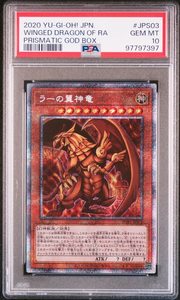 This PSA 10 Winged Dragon of Ra from the 2020 Prismatic God Box is an absolute gem for any Yu-Gi-Oh! collector. The card’s pristine condition, stunning holographic finish, and rare Japanese print make it a must-have for serious fans. Its high-grade certification ensures top-tier quality, perfect for display or investment. A true treasure for duelists and collectors alike!