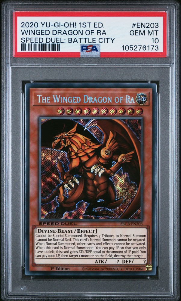2020 YU-GI-OH! SPEED DUEL: BATTLE CITY BOX 1ST EDITION #EN203 THE WINGED DRAGON OF RA PSA 10 2020 YU-GI-OH! SPEED DUEL: BATTLE CITY BOX 1ST EDITION #EN203 THE WINGED DRAGON OF RA PSA 10 Purchase Info Thank you for your interest in this item consigned with PSA! By purchasing or making an offer on this item, you acknowledge and agree to the following terms: All sales are final. Returns not accepted. Payment must be made upon purchase of the item. All items are sold "as is" and without warranty of Collectors Universe, Inc. (d/b/a PSA), and ANY AND ALL IMPLIED WARRANTIES ARE DISCLAIMED AND EXCLUDED. Sales tax may apply depending on shipping address. PSA does not guarantee that another third-party grading company's authentication or certification of an item as genuine is correct or accurate. Neither a difference of opinion between third-party grading companies about authenticity, nor a company's subsequent reversal of its earlier authentication or certification of an item, will be a basis for rescinding a sale. Any dispute with another third-party grading company relating to the authenticity of an item must be resolved directly with that other company. Collectors' maximum liability in the event of loss or damage to an item during shipping will be the lesser of (a) the price paid for the item and (b) the change in fair market value of the item. You release Collectors from all other liability including for any claims of punitive damages, emotional distress, consequential damages, lost profits, or lost interest, except as prohibited by law. Shipping Purchased Items will be shipped directly from PSA Vault. You stay hands-free. PSA Vault When you purchase this item, you can save on sales tax and selling fees by keeping it in the PSA Vault, official Vault of eBay. Items already in PSA Vault and will be sent to PSA Vault will have no shipping charge Storage of any items with the PSA Vault will be subject to the PSA Vault Terms of Service. Consignment PSA has competitive rates on the world's largest collectibles marketplace with the option to list from the PSA Vault or immediately after PSA authentication and grading. Sale Price Under $100 $100 - $499 $500 - $999 $1,000 - $2,499 $2,500 - $4,999 $5,000+ Seller Fee 16% 14% 13% 10% 9% 7% Sellers pay a single fee as reflected above; no additional eBay fees are incurred. There is a $5 minimum fee on sold items.