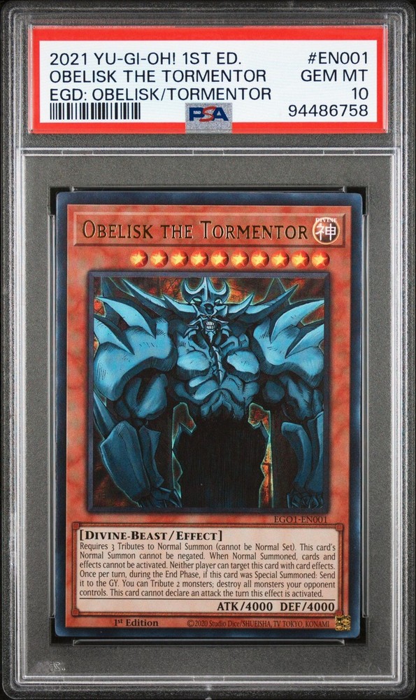This highly sought-after 2021 Yu-Gi-Oh! 1st Ed #EN001 Obelisk The Tormentor card is a must-have addition to any collector's deck. With a PSA 10 rating and a population of only 10, this card is a rare find that any Yu-Gi-Oh! TCG enthusiast would love to add to their collection. The card is part of the Yugi set and was manufactured in 2021, making it a valuable and unique addition to any deck. Don't miss out on the opportunity to own this incredible card!