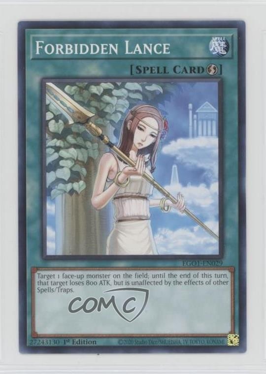 2021 Yu-Gi-Oh! Egyptian God Deck: Obelisk the Tormentor - [Base] - 1st Edition #EGO1-EN029 Forbidden Lance COMC Item: 230846765 - YuGiOh Card - Featuring Forbidden Lance Search for more: 2021 Yu-Gi-Oh! Egyptian God Deck: Obelisk the Tormentor Search for more: 2021 Yu-Gi-Oh! Egyptian God Deck: Obelisk the Tormentor - [Base] - 1st Edition View all of our Listings Auctions Buy It Now About Us Located in the beautiful Pacific Northwest, COMC (Check Out My Cards) is the world's largest consignment service for trading card singles. More than 10,000 people have used our consignment service to list over 50 million trading cards. Find out how we can help you consign your items on eBay by contacting us through eBay messaging. COMC -- "The Safe & Easy Way to Buy & Sell" Raw Condition for Modern Cards Unless otherwise noted, raw modern cards are listed in Near Mint-Mint condition or better. A NM-MT card appears to be Mint at first glance, but upon closer inspection, may exhibit some of the following: minor print defects (e.g. roller marks, print line, dimple), minor scratches, slight edge wear, and slight corner wear. Centering is clearly visible in the images provided and does not factor into our condition assessment. Raw Condition for Vintage Cards Unless otherwise noted, raw vintage cards are listed in Excellent condition or better. An EX card may exhibit some of the following: minor rounding of corners, surface wear, print defects, light scratches, and slight edge wear/chipping. Centering is clearly visible in the images provided and does not factor into our condition assessment. Domestic Shipping Combined shipping for multiple items is available. To receive combined shipping, please ensure all desired items are in your eBay shopping cart before proceeding to checkout. eBay limits orders to 40 items per order. We automatically combine multiple orders placed on the same day. If you place multiple orders on the same day, please contact us to request a refund of applicable shipping costs. Signature confirmation may be required on invoices over $400. All cards are protected and shipped securely. International Shipping COMC offers eBay's International Shipping (EIS) for international orders under $2,500* (see country exceptions below). All duties and import fees are paid at checkout; in the rare event that there are additional import fees upon delivery, these are borne by the buyer. EIS packages route through a shipping hub in Erlanger, KY before shipping to their final destination. Please note that EIS does not allow for combined shipments. The shipping rates are determined by eBay and cannot be adjusted. *Maximum sale price exceptions: Colombia, Kuwait ($2,000); Taiwan ($1,539); Chile, Costa Rica, Guatemala, Honduras, Trinidad and Tobago ($1,000); Antigua and Barbuda, Aruba, Belize, Dominica, Grenada, Philippines, Saint Kitts and Nevis, Saint Lucia, Montserrat, Turks and Caicos Islands ($500); Dominican Republic, El Salvador ($200). Please request a shipping quote through eBay messaging for orders that exceed the maximum sale price supported by eBay's International Shipping. You will be responsible for all duties and import fees for international orders shipped outside the EIS. All cards are protected and shipped securely. Payment COMC does not accept offers on our cards through our eBay storefront. COMC utilizes eBay’s managed payments system. If you are experiencing difficulties making a payment, please contact eBay for assistance. Return Policy Returns are only accepted on the rare occasion the item is not as described. If you are making a return, please initiate the return process through eBay so a mailing label can be provided for you. Prior to listing, our expert team carefully assessed this item to represent it accurately. Please review the description and high-definition images prior to purchasing to ensure this item meets your satisfaction. We welcome you to contact us if you have further questions about this item. Trust and Integrity COMC carefully assesses each item consigned to us to prevent fraudulent items from entering the marketplace. If you believe an item offered on COMC may be fraudulent, please contact us with details so we can investigate the issue. Items we determine are outside our supported items policy may be removed. Last Modified: 6/11/2025 1:23:31 PM PDT