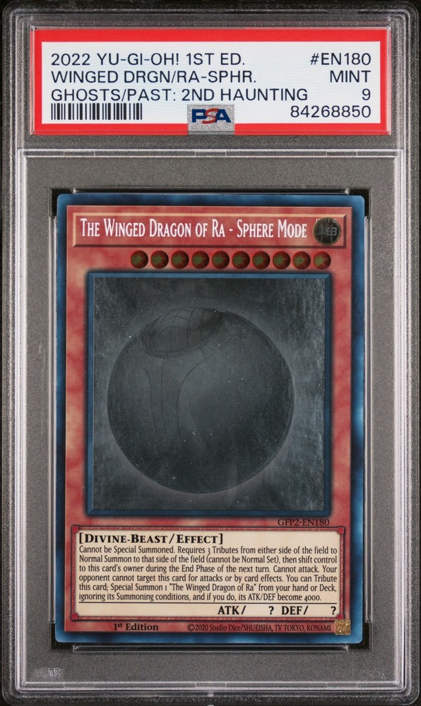 2022 YU-GI-OH! GFP2-GHOSTS FROM THE PAST: THE 2ND HAUNTING 1ST EDITION #EN180 THE WINGED DRAGON OF RA-SPHERE MODE PSA 9 2022 YU-GI-OH! GFP2-GHOSTS FROM THE PAST: THE 2ND HAUNTING 1ST EDITION #EN180 THE WINGED DRAGON OF RA-SPHERE MODE PSA 9 Purchase Info Thank you for your interest in this item consigned with PSA! By purchasing or making an offer on this item, you acknowledge and agree to the following terms: All sales are final. Returns not accepted. Payment must be made upon purchase of the item. All items are sold "as is" and without warranty of Collectors Universe, Inc. (d/b/a PSA), and ANY AND ALL IMPLIED WARRANTIES ARE DISCLAIMED AND EXCLUDED. Sales tax may apply depending on shipping address. PSA does not guarantee that another third-party grading company's authentication or certification of an item as genuine is correct or accurate. Neither a difference of opinion between third-party grading companies about authenticity, nor a company's subsequent reversal of its earlier authentication or certification of an item, will be a basis for rescinding a sale. Any dispute with another third-party grading company relating to the authenticity of an item must be resolved directly with that other company. Collectors' maximum liability in the event of loss or damage to an item during shipping will be the lesser of (a) the price paid for the item and (b) the change in fair market value of the item. You release Collectors from all other liability including for any claims of punitive damages, emotional distress, consequential damages, lost profits, or lost interest, except as prohibited by law. Shipping Purchased Items will be shipped directly from PSA Vault. You stay hands-free. PSA Vault When you purchase this item, you can save on sales tax and selling fees by keeping it in the PSA Vault, official Vault of eBay. Items already in PSA Vault and will be sent to PSA Vault will have no shipping charge Storage of any items with the PSA Vault will be subject to the PSA Vault Terms of Service. Consignment PSA has competitive rates on the world's largest collectibles marketplace with the option to list from the PSA Vault or immediately after PSA authentication and grading. Sale Price Under $100 $100 - $499 $500 - $999 $1,000 - $2,499 $2,500 - $4,999 $5,000+ Seller Fee 16% 14% 13% 10% 9% 7% Sellers pay a single fee as reflected above; no additional eBay fees are incurred. There is a $5 minimum fee on sold items.