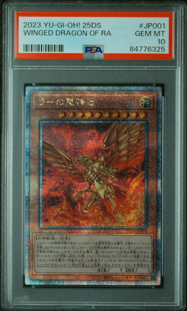 2023 YU-GI-OH! JAPANESE 25DS-QUARTER CENTURY DUEL SET "THE WINGED DRAGON OF RA" #JP001 THE WINGED DRAGON OF RA PSA 10 2023 YU-GI-OH! JAPANESE 25DS-QUARTER CENTURY DUEL SET "THE WINGED DRAGON OF RA" #JP001 THE WINGED DRAGON OF RA PSA 10 Purchase Info Thank you for your interest in this item consigned with PSA! By purchasing or making an offer on this item, you acknowledge and agree to the following terms: All sales are final. Returns not accepted. Payment must be made upon purchase of the item. All items are sold "as is" and without warranty of Collectors Universe, Inc. (d/b/a PSA), and ANY AND ALL IMPLIED WARRANTIES ARE DISCLAIMED AND EXCLUDED. Sales tax may apply depending on shipping address. PSA does not guarantee that another third-party grading company's authentication or certification of an item as genuine is correct or accurate. Neither a difference of opinion between third-party grading companies about authenticity, nor a company's subsequent reversal of its earlier authentication or certification of an item, will be a basis for rescinding a sale. Any dispute with another third-party grading company relating to the authenticity of an item must be resolved directly with that other company. Collectors' maximum liability in the event of loss or damage to an item during shipping will be the lesser of (a) the price paid for the item and (b) the change in fair market value of the item. You release Collectors from all other liability including for any claims of punitive damages, emotional distress, consequential damages, lost profits, or lost interest, except as prohibited by law. Shipping Purchased Items will be shipped directly from PSA Vault. You stay hands-free. PSA Vault When you purchase this item, you can save on sales tax and selling fees by keeping it in the PSA Vault, official Vault of eBay. Items already in PSA Vault and will be sent to PSA Vault will have no shipping charge Storage of any items with the PSA Vault will be subject to the PSA Vault Terms of Service. Consignment PSA has competitive rates on the world's largest collectibles marketplace with the option to list from the PSA Vault or immediately after PSA authentication and grading. Sale Price Under $100 $100 - $499 $500 - $999 $1,000 - $2,499 $2,500 - $4,999 $5,000+ Seller Fee 16% 14% 13% 10% 9% 7% Sellers pay a single fee as reflected above; no additional eBay fees are incurred. There is a $5 minimum fee on sold items.