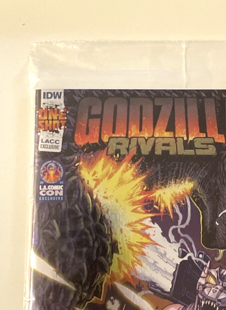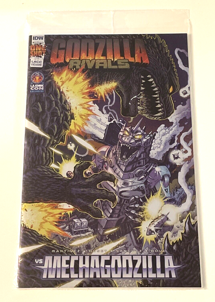 2023 LACC #1 GODZILLA RIVALS VS MECHAGODZILLA FOIL EXCLUSIVE Limited Edition of 500. The comic is published by IDW and features the epic battle between Godzilla and Mechagodzilla. Comic was only Available at Los Angeles Comic Con The comic comes brand new still sealed in the original polybag and boarded, in nrmint or better condition. See pics! Buyer pays $5.65 for US Shipping. See my other GODZILLA, TMNT, MARVEL and NYCC/SDCC Auctions. Always happy to combine shipping where posssible. Thank You!