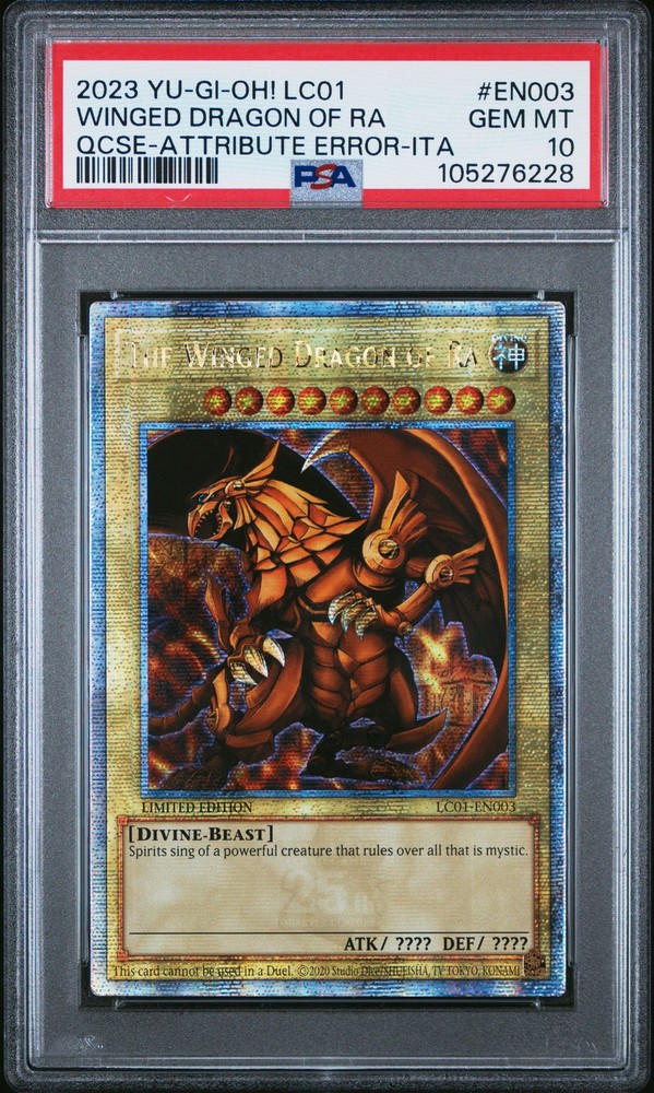 2023 YU-GI-OH! LC01-LEGENDARY COLLECTION: 25TH ANNIVERSARY EDITION QUARTER CENTURY SECRET RARE-ATTRIBUTE ERROR-ITALIAN #EN003 THE WINGED DRAGON OF RA PSA 10 2023 YU-GI-OH! LC01-LEGENDARY COLLECTION: 25TH ANNIVERSARY EDITION QUARTER CENTURY SECRET RARE-ATTRIBUTE ERROR-ITALIAN #EN003 THE WINGED DRAGON OF RA PSA 10 Purchase Info Thank you for your interest in this item consigned with PSA! By purchasing or making an offer on this item, you acknowledge and agree to the following terms: All sales are final. Returns not accepted. Payment must be made upon purchase of the item. All items are sold "as is" and without warranty of Collectors Universe, Inc. (d/b/a PSA), and ANY AND ALL IMPLIED WARRANTIES ARE DISCLAIMED AND EXCLUDED. Sales tax may apply depending on shipping address. PSA does not guarantee that another third-party grading company's authentication or certification of an item as genuine is correct or accurate. Neither a difference of opinion between third-party grading companies about authenticity, nor a company's subsequent reversal of its earlier authentication or certification of an item, will be a basis for rescinding a sale. Any dispute with another third-party grading company relating to the authenticity of an item must be resolved directly with that other company. Collectors' maximum liability in the event of loss or damage to an item during shipping will be the lesser of (a) the price paid for the item and (b) the change in fair market value of the item. You release Collectors from all other liability including for any claims of punitive damages, emotional distress, consequential damages, lost profits, or lost interest, except as prohibited by law. Shipping Purchased Items will be shipped directly from PSA Vault. You stay hands-free. PSA Vault When you purchase this item, you can save on sales tax and selling fees by keeping it in the PSA Vault, official Vault of eBay. Items already in PSA Vault and will be sent to PSA Vault will have no shipping charge Storage of any items with the PSA Vault will be subject to the PSA Vault Terms of Service. Consignment PSA has competitive rates on the world's largest collectibles marketplace with the option to list from the PSA Vault or immediately after PSA authentication and grading. Sale Price Under $100 $100 - $499 $500 - $999 $1,000 - $2,499 $2,500 - $4,999 $5,000+ Seller Fee 16% 14% 13% 10% 9% 7% Sellers pay a single fee as reflected above; no additional eBay fees are incurred. There is a $5 minimum fee on sold items.