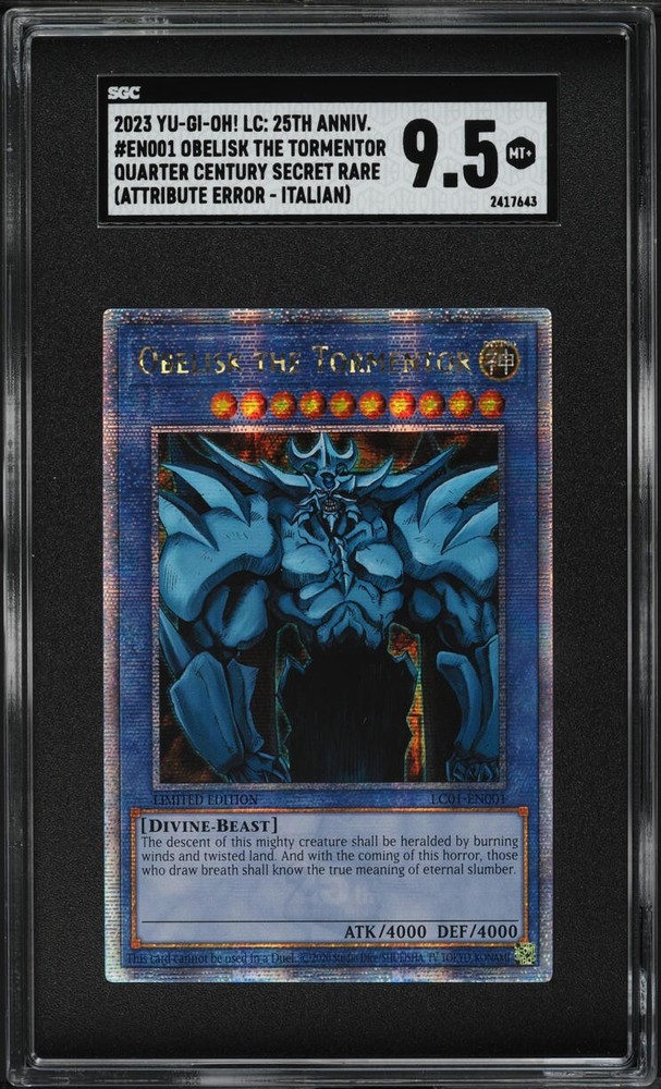 Celebrate a quarter-century of strategic duels with the 2023 Yu-Gi-Oh! LC01 25th Anniversary Obelisk The Tormentor card. This iconic creature from the legendary LC01 series is a must-have for collectors and players alike, looking to elevate their game with a powerful addition to their deck. Graded SGC 9.5, this card is a testament to superior quality and preservation, ensuring it stands out in any collection. With its intricate artwork and strategic gameplay potential, Obelisk The Tormentor is a timeless piece that continues to be a staple in the Yu-Gi-Oh! TCG universe.