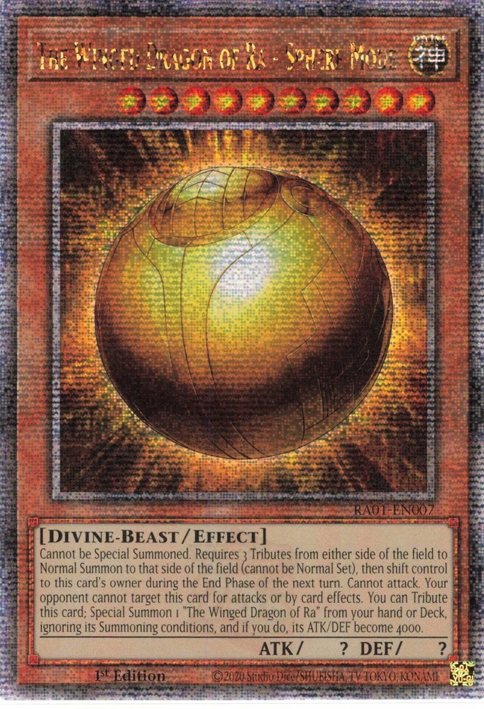 You are purchasing a 2023 Yu-Gi-Oh! 25th Anniversary Rarity Collection The Winged Dragon of Ra Sphere Mode #RA01-0007 Quarter Century Secret Rare . Set: 25th Anniversary Rarity Collection Character: The Winged Dragon of Ra S phere Mode Grade: NM Securely shipped via USPS. You will receive the exact item in the photographs. Thank you for looking. Listed With Mascot .