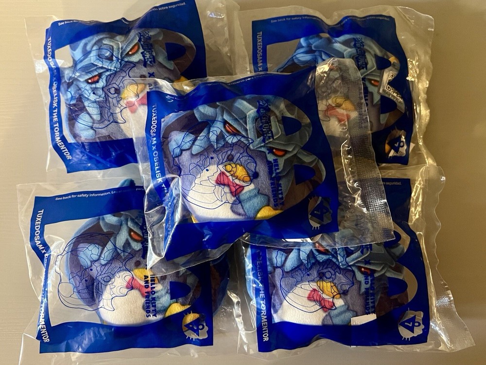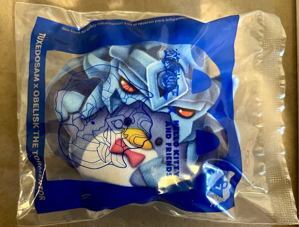 This is a limited edition 2024 McDonald's Yu-Gi-Oh! X Hello Kitty plush toy featuring Tuxedosam and Obelisk The Tormentor. The toy is made of high-quality plush material and has been manufactured in China. It is a collectible item and a perfect addition to any Yu-Gi-Oh! fan's collection. The toy's colors are multicolor, and it has a unique design that makes it stand out from other collectibles. The Hello Kitty brand is known for its high-quality products, and this toy is no exception. It is perfect for children and adults alike who love to collect Yu-Gi-Oh! merchandise. The California Prop 65 Warning does not apply to this item. Get your hands on this rare and exclusive toy today!